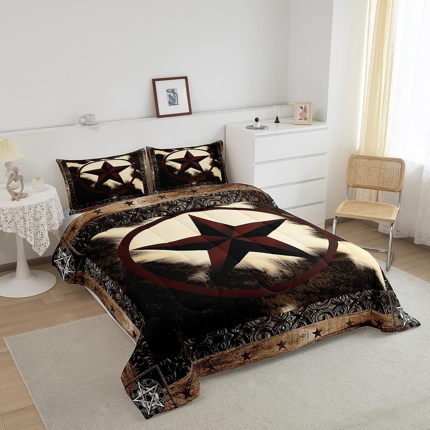 Erosebridal Highland Cow Comforter Set ,Farmhouse Cowhide Bedding Sets Full Size,Western Texas Star Duvet Insert Warm,Rustic Wooden Fur Down Comforter with 2 Pillow Shams Soft
