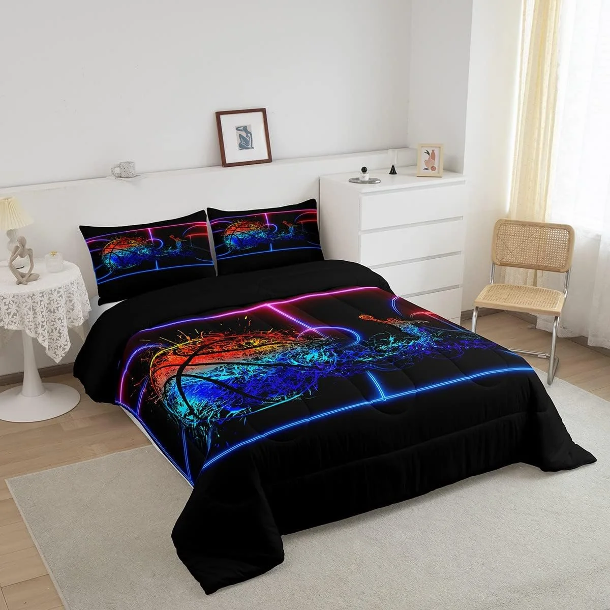 Erosebridal Basketball Comforter Set Twin 3D Sports Bedding Sets Teens Men Tie Dye Fire and Ice Comforter Player Sport Game Warm Soft Lightweight Red Blue Quilt Set, Black
