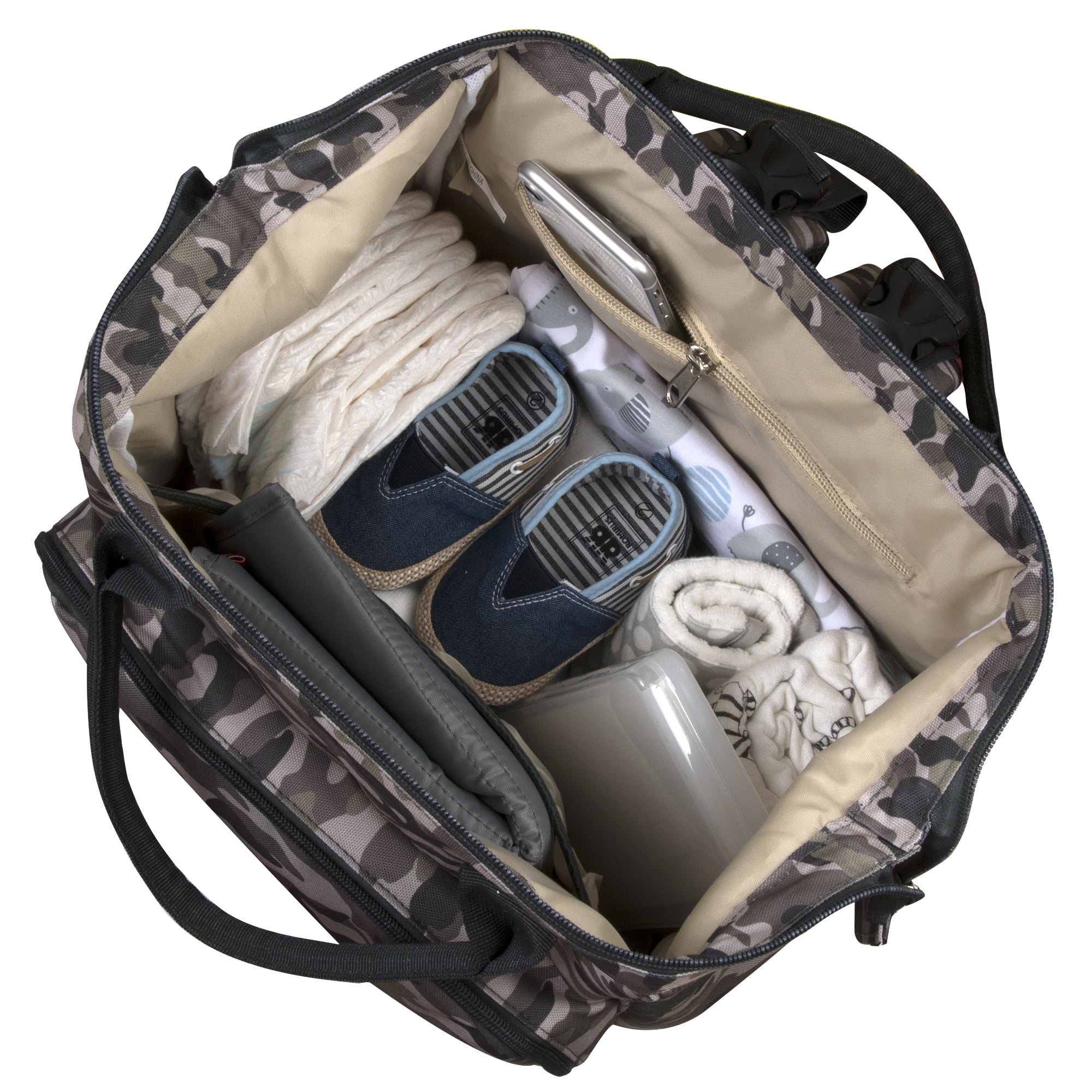 $19.75On-trend camo print frame backpack is a great value, combining fashion with function. Featuring 7 amazingly roomy pockets, easily tote or carry all baby needs. Tuck diapers and other necessities into the front zip pocket, and store wipes, powder, or even a drink in its deep side pockets. Store clothes, shoes, and snacks inside its spacious interior, and slip books or electronics in its inner pocket, too! You will not believe how lightweight and versatile this bag is. It can even be hooked to strollers with its adjustable length stroller straps. It comes with a wipe-clean padded changing pad, so changing baby anywhere is clean, safe, and easy. This modern diaper bag has it all.