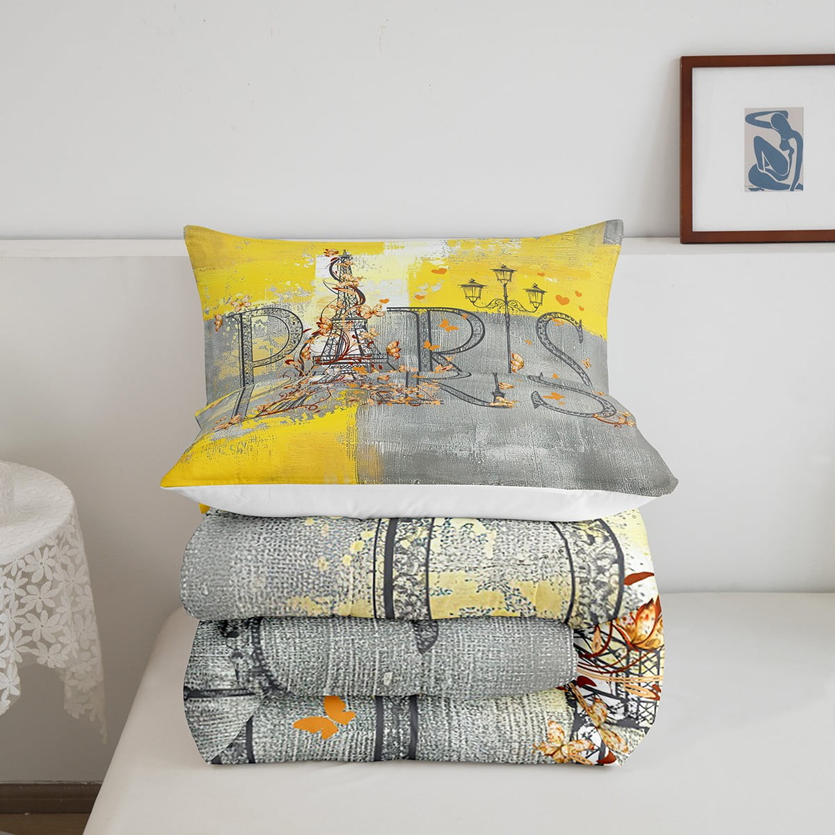 Erosebridal Eiffel Tower Comforter Twin Grey Yellow Bedding Set, Grunge Ombre Down Comforter Modern Watercolor Bed Set, Abstract Tie Dye Quilted Duvet Geometric Patchwork Decor
