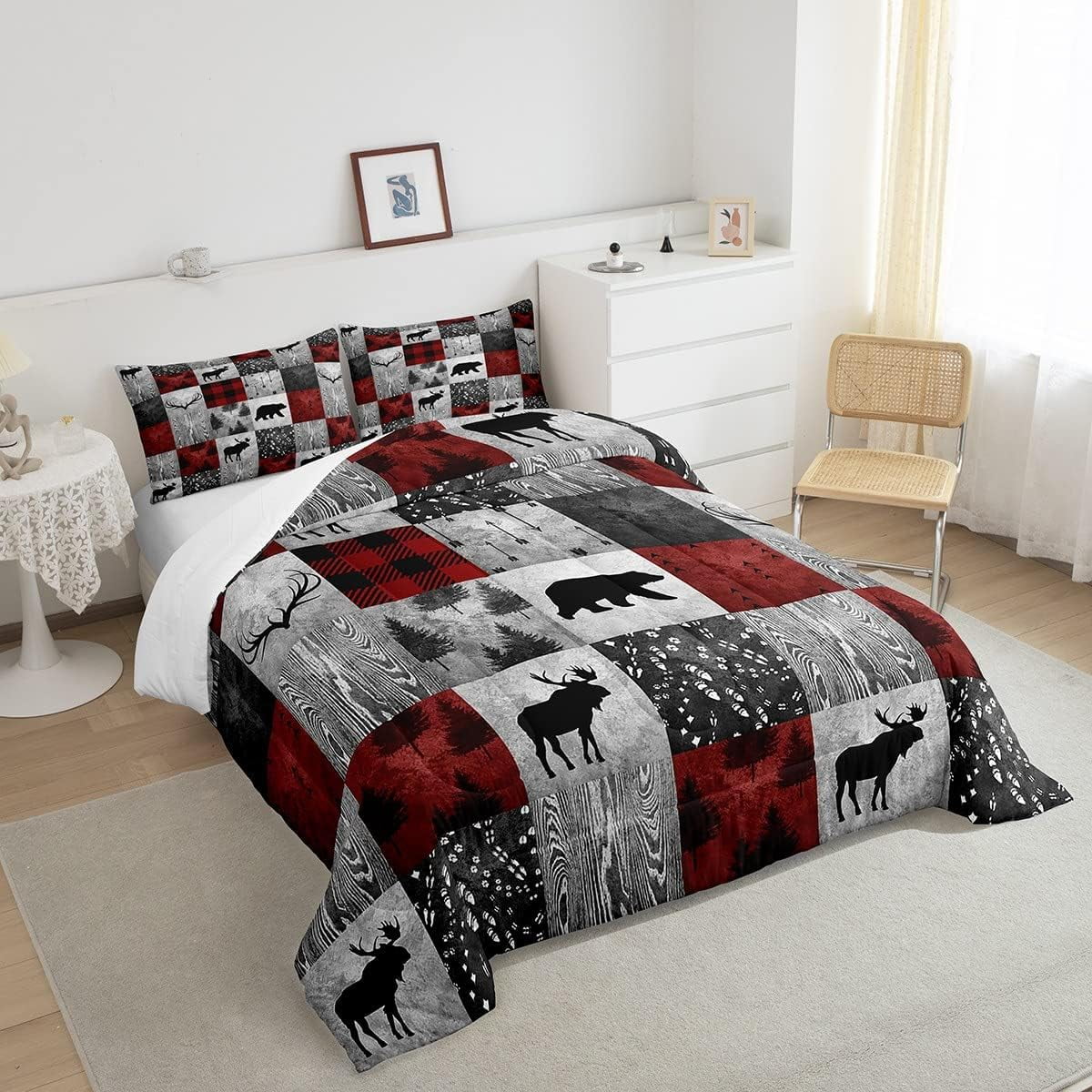 Erosebridal Lodge Deer Comforter Twin,Burgundy Buffalo Plaid Check Bedding Set ,Bear Elk Antler Wild Hunting Animal Duvet Insert,Merry Christmas Down Comforter with 1 Pillowcase