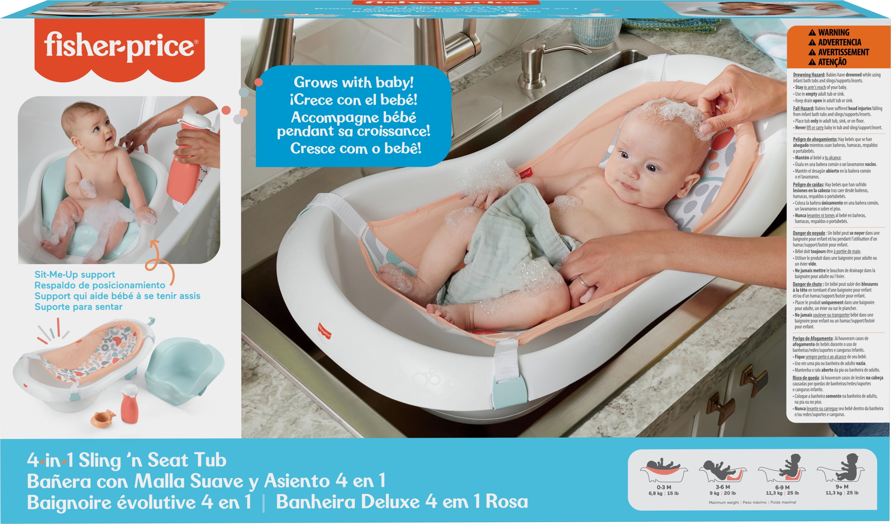 $38.69Original price was: $38.69.$31.49Current price is: $31.49.The Fisher-Price 4-in-1 Sling ‘n Seat Tub keeps bath time comfortable and fun as your baby grows from newborn to toddler. From the soft mesh sling built for baby’s first bath to a supportive seat for wobbly sitters, and a spacious toddler tub with a scoop and rinse bottle, this convertible baby tub can do it all. With four stages of use, you and your tiny bather are supported from newborn to toddler and all the splashes in between.