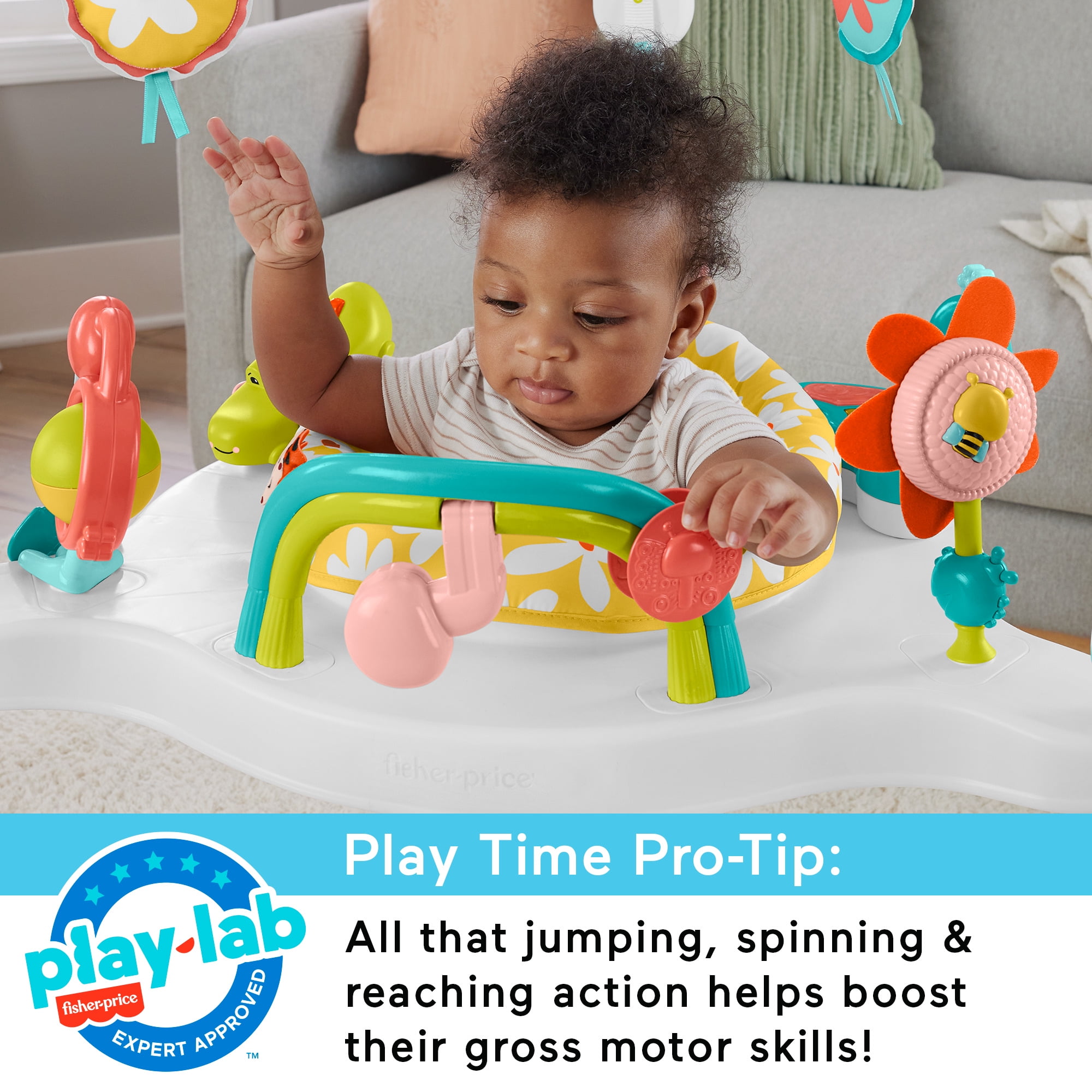 $84.11Baby can spring into fresh sensory fun with the Fisher-Price Blooming Fun Jumperoo activity center. Every jump activates fun lights, music and sounds, encouraging your little one to keep bouncing and strengthening those gross motor skills. This freestanding jumper has a spinning seat and a variety of hands-on activities all around for your baby to explore, plus three height adjustments to grow along with your baby. Max. weight 25 lb/ 11,3 kg. Use only for a child who is able to hold head upright unassisted and who is not able to walk or climb out of product.