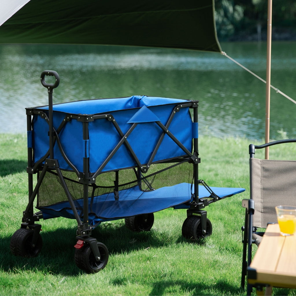 Folding Double Decker Garden Wagon, VECUKTY Heavy Duty Collapsible Camping Wagon Cart with 54″ Lower Decker, All-Terrain Big Wheels Support Up to 500lbs, Blue