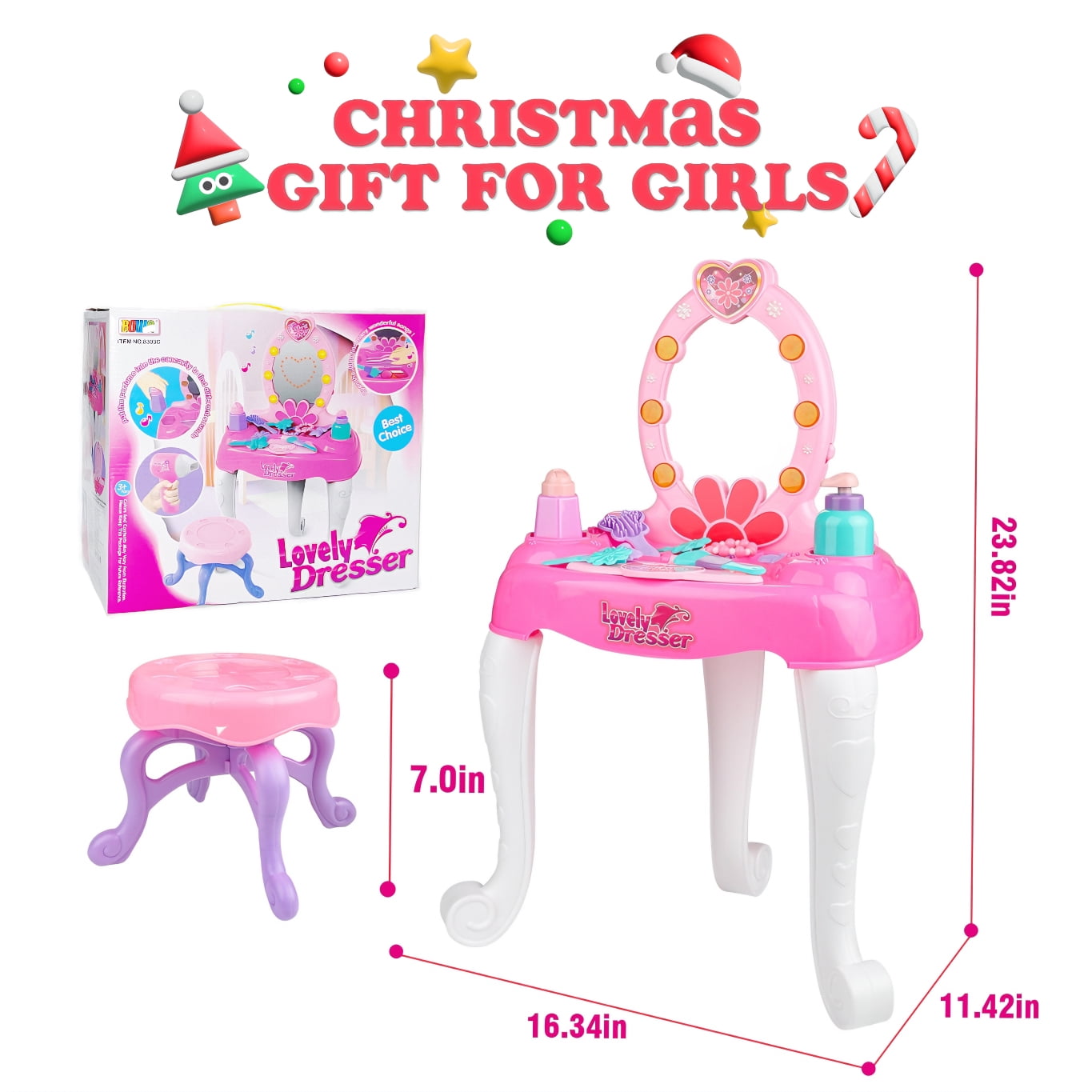 Freecat Kids Makeup Vanity Set With Mirror And Stool, Toys for 3-6 Years Old Girls Pretend Play & Dress Up Toy, Toddler Vanity Table Set With Light And Music Sound, Birthday Gift.