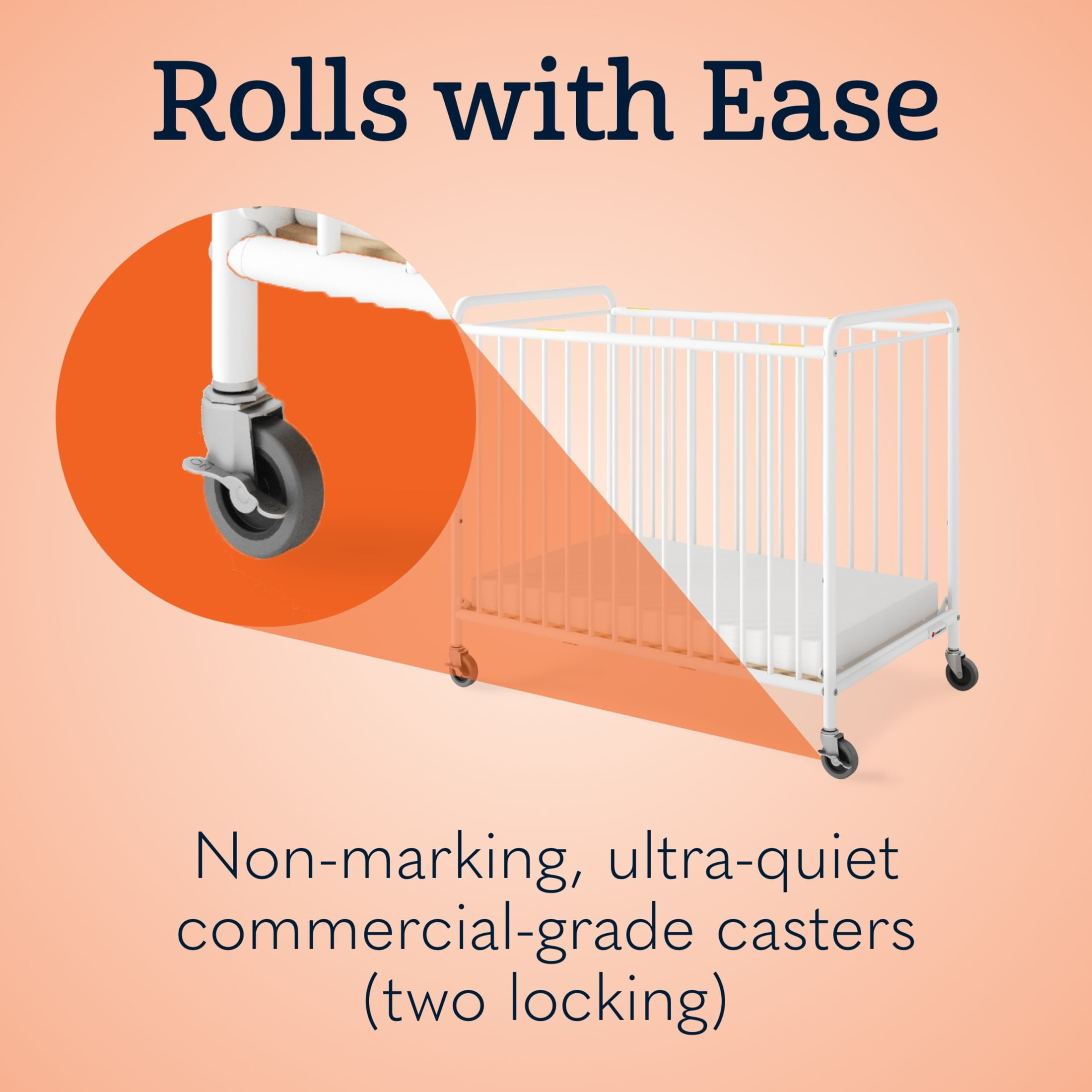 $300.99The Foundations Chelsea Clear Choice Mini Euro Crib with Casters is the perfect choice for anyone who needs an extra crib. Its heavy duty steel construction features a 360 degree welding process which ensures unsurpassed strength and prevents the harboring of bacteria. A 3-in. antimicrobial mattress that is also hypoallergenic, and made from dense, supportive foam for extra comfort, is included for your convenience. Easy to clean, the crib has a non-porous powder-coated finish for added durability. An adjustable mattress board adjusts to two positions to make it easy to get your baby out of the crib and allows you to lower the mattress as your baby grows taller. You’ll love the Clear Choice end design which makes it easy for your to see your baby on the baby monitor. Made to fit through standard size doorways, it is easy to move this non-folding crib to a different room whenever needed