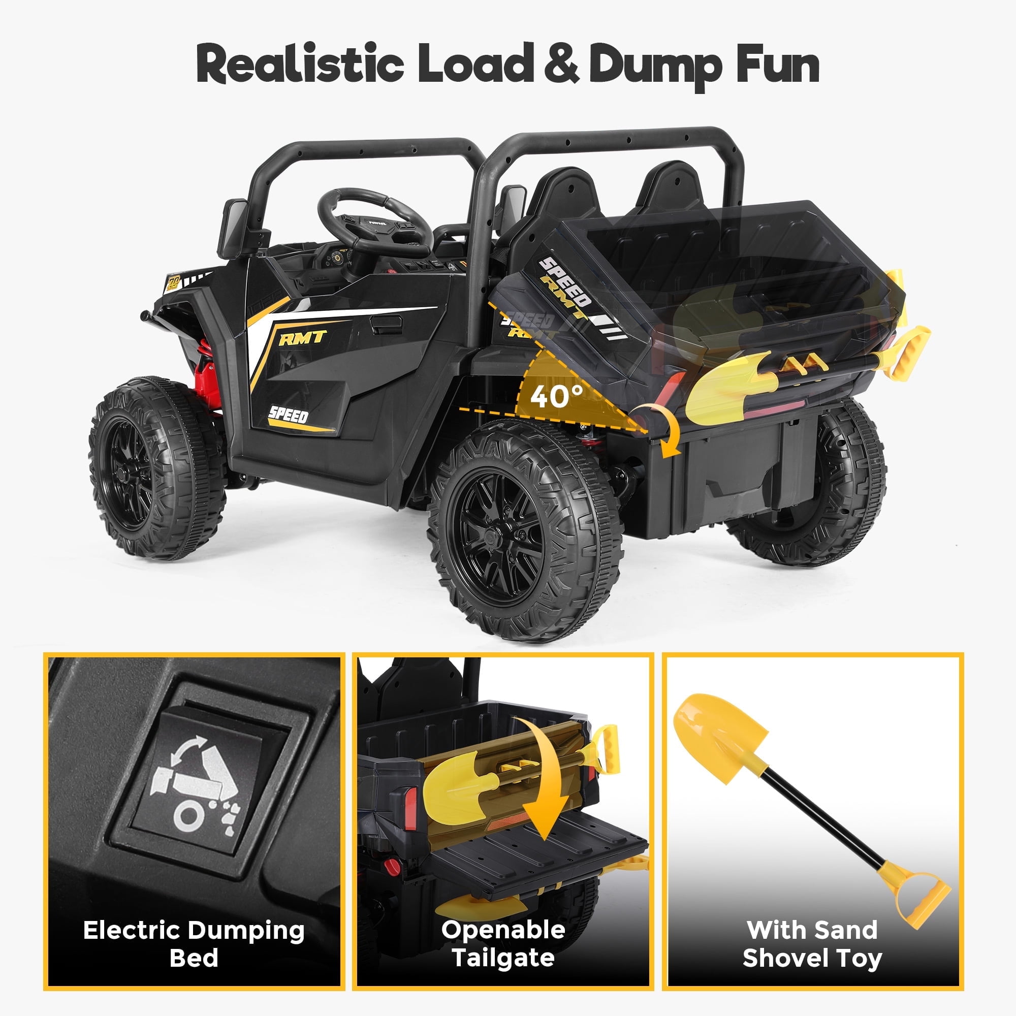 FUNTOK 24V 2 Seater Kids Electric Ride on Toys Car,4 x 200W Motor Battery Powered UTV,4WD Motorized Cars for Toddler w/ Dump Bed,Shovel,Remote Control,Bluetooth & 4 Wheel Suspension,Black