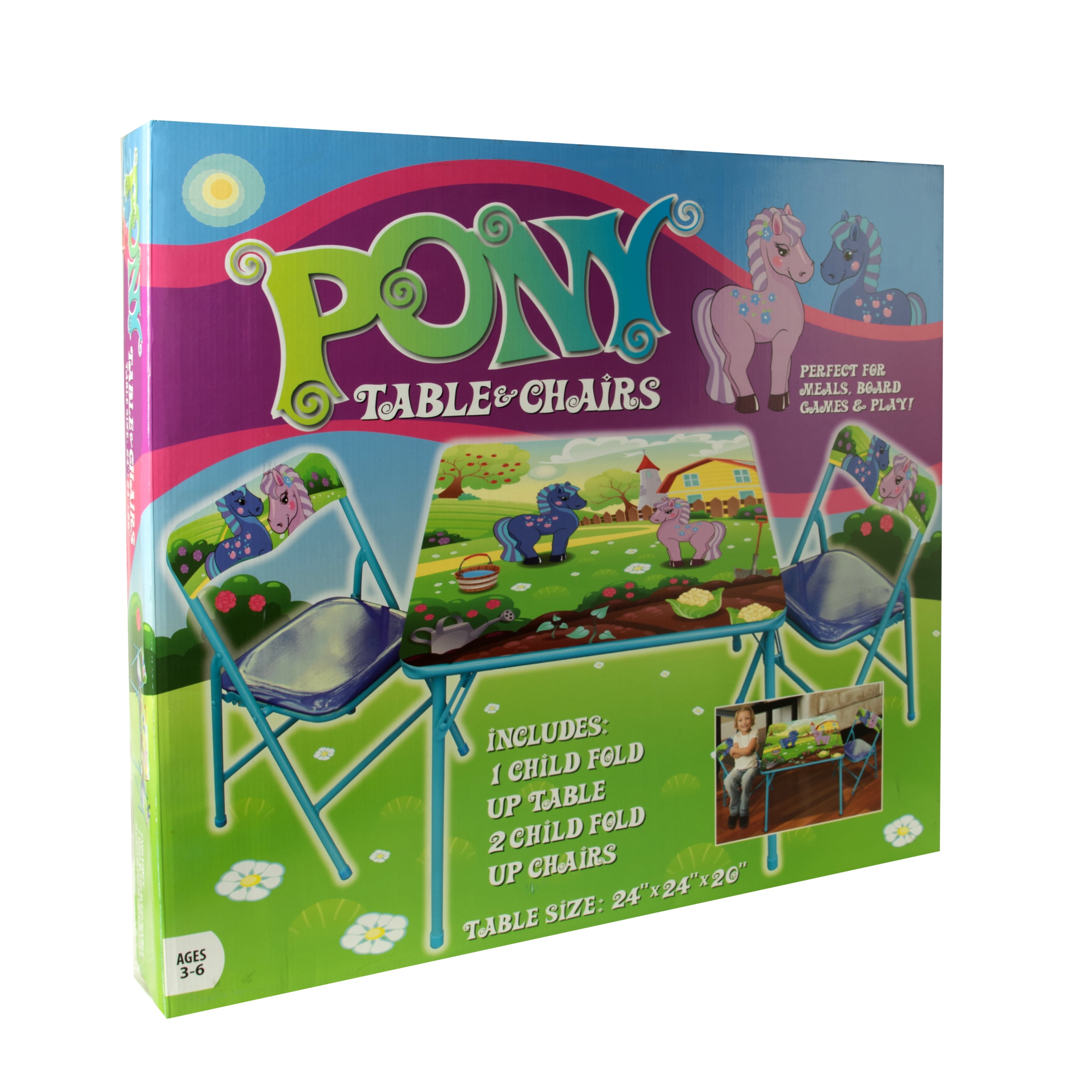 $47.29This Gener8 Pony Table and Chairs is the perfect spot for your little one to color, have tea parties, or play pretend. The table features a fun whimsical pony design and is made of metal, plastic, and steel to withstand endless play sessions. You don’t have to worry about safety as the chairs have a Safety Lock feature to prevent tipping. Your Child will love the colorful graphics in light blues, Pinks, Purple and Greens, the design features two ponies in Blue and Pink. The table makes a great addition to a bedroom, or playroom. Perfect fit for snack time, Game Time or even homework. If you are not looking for a Pony Table and Chair set, take a peek at the Barnyard Table and chair set #GS75044. Recommended Ages 3 to 8 Years