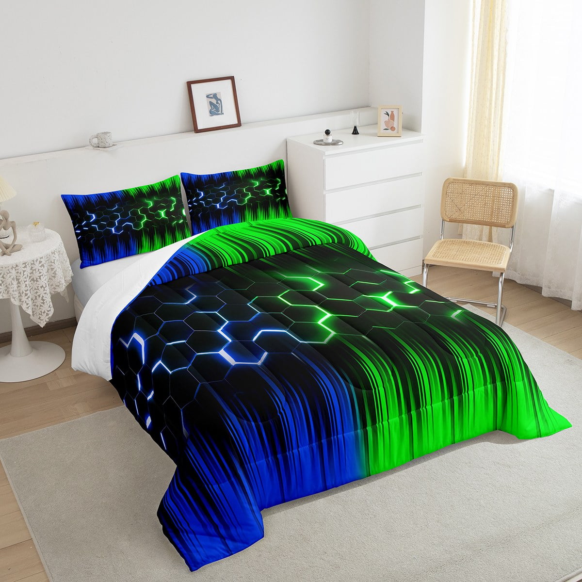 Geometric Honeycomb Comforter Set Twin Neon Green Blue Black Striped Bedding Set Adult,Abstract Gradient Ombre Comforter Set Geometry Beehive Hexagon Bed Set 2Pcs