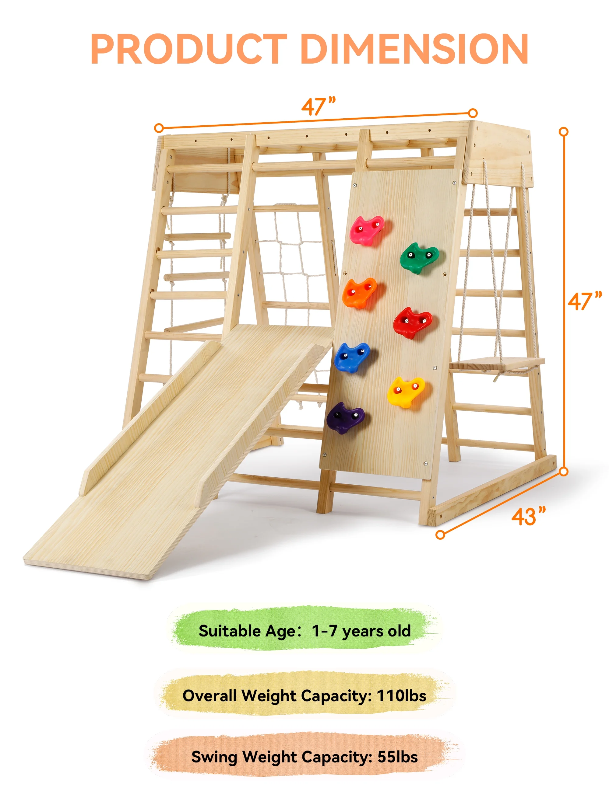 $146.19Advanced and Unique Design for Children to Play and Enjoy Different Kinds of Fun Create an exciting and engaging playtime experience for your little one with our 7-in-1 Jungle Gym Baby Climbing Toys. This multifunctional set includes a slide, climbing wall, rope wall net, swing, and ladder, offering endless fun and exploration. It helps enhance coordination and balance while providing a safe and sturdy environment for play. Made from high-quality materials, this jungle gym is built to last. Bring out the adventurous spirit in your child and watch them grow while having a blast! Multiple ways to play! Monkey bars Climbing rock Climbing net Swing Slide Roap ladder Boost Motor Skills and Nurture Balance Our playground jungle gym allows children to play autonomously, fostering the advancement of their motor skills. Kids are stimulated to discover multifaceted forms of play, inspiring a surge in their creativity and imagination. Robust Solid Wood Build The children’s climbing apparatus is capable of withstanding a maximum load of up to 200 pounds on each climbing section, accommodating 3-5 children simultaneously. The rounded edges and stable structure ensure your baby’s safety during playtime. 7-in-1 Montessori Climbing Set This indoor playground features a slide, climbing rock, crawling ladder, climbing net, monkey bars, horizontal bar, and swing. Children can play independently and improve their motor skills.