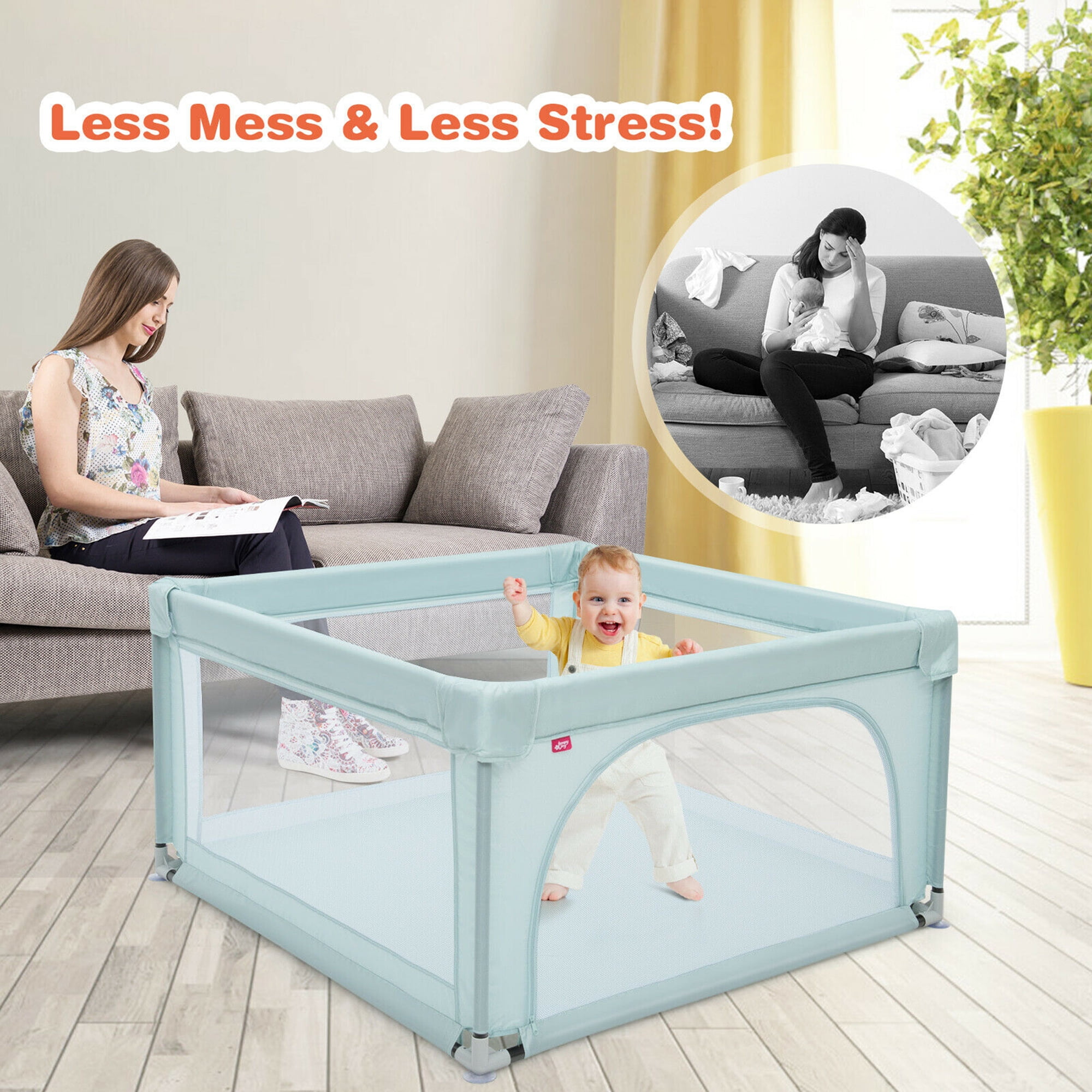 $54.84When you need kid-free time to cook dinner, get ready for work or take a bathroom break, you may need a baby playpen that can keep the baby in a safe area. Our mesh baby playpen has been carefully designed in every detail to provide a safe play area for your little ones. The BPA-free oxford cloth is durable wear-resistant also safe for kids to climb, touch, or even bite. Meanwhile, its firm structure can effectively prevent tip over an accidental move and the visible side panels let children see their mothers outside the fence from multiple sides no matter sitting or lying down, which will make them feel safe and you can interact with your baby at any time. It is a great helper for parents who need more free time and babies who need a spacious play yard.