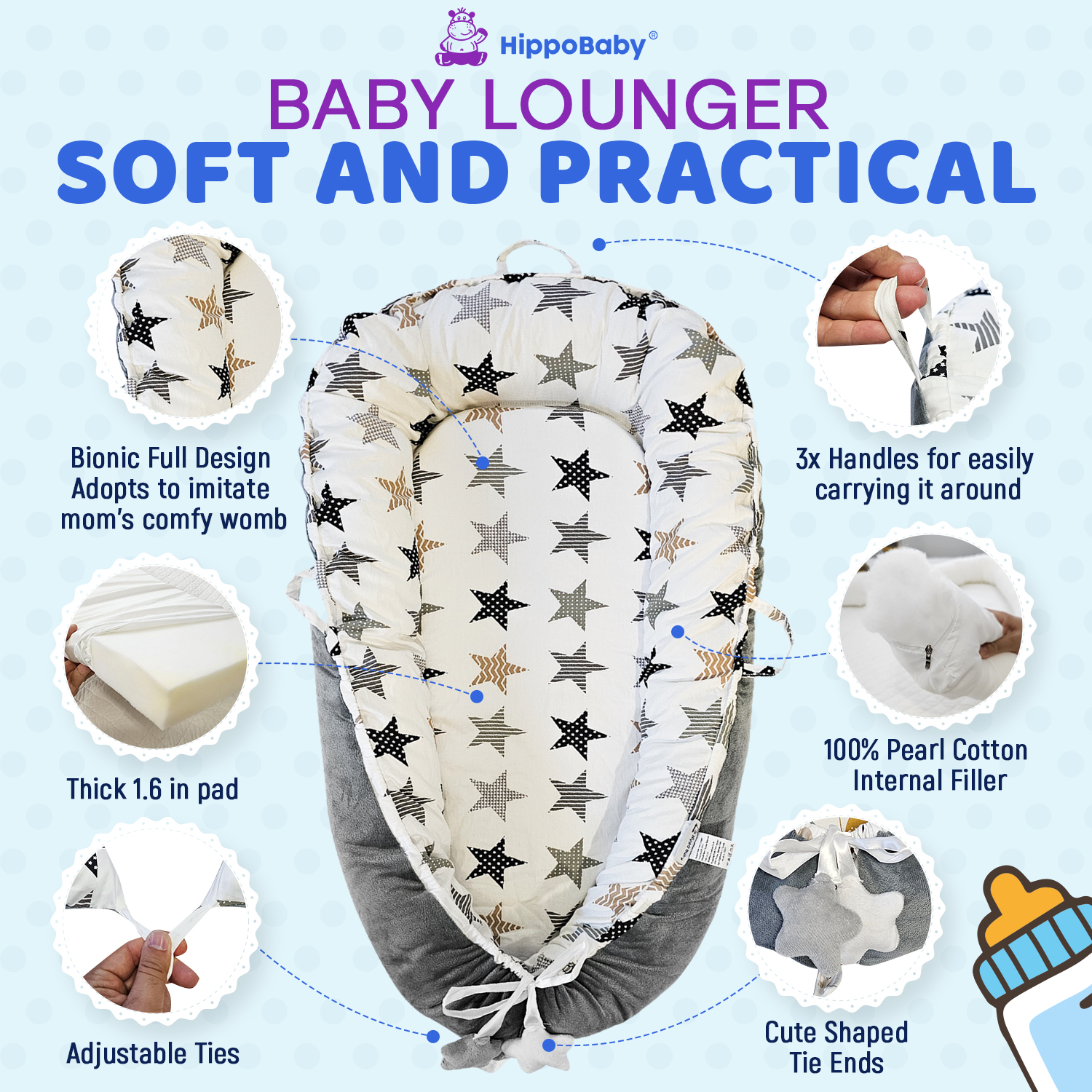 HippoBaby Baby Lounger Pillow 0-12 months | Soft Breathable Cotton Baby Lounger Pillow (Star)
