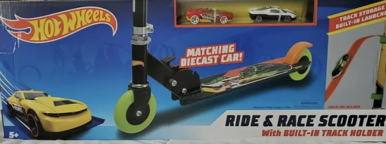 $34.40The Hot Wheels Ride & Race 2-wheel kids scooter comes with 2 matching cars and built-in track storage! Featured with 100mm diameter PVC Wheels. This scooter is great for around the street and the skate park. This Hot Wheels Kick Scooter has a foldable feature to easily store anywhere. Whether you need to take it on the go or store it away. The soft foam handles make for a gentle grip and the quick stop rear brake adds a layer of safety for quick decisions. This scooter is lightweight and sturdy to handle the wear and tear of everyday use. This scooter is for Boys and Girls Ages 6 and up.