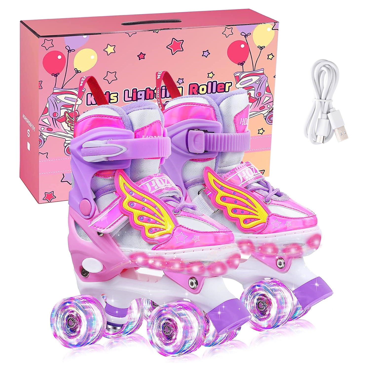 $60.19Original price was: $60.19.$29.23Current price is: $29.23.Hozzen adjustable roller skates allow you to fit the skate to your child’s growing foot. Simply press the button beside the skate and stretch the shoes to 4 different sizes. Thickened collars and well-padded liners are not easy to break or distort, providing superior ankle protection and better comfort for little skaters during their rides. The mesh fabric is very breathable, which allows for optimal air circulation and prevents stuffy feet. All 8 LED wheels will instantly light up upon the slightest movement and provide a multi-color rainbow display, no battery needed! Ideal for roller derby and make your girl stands out as a shining star. Hozzen quad roller skates are strong and durable with additional anti-abrasion toe and heel caps. Moreover, the 2.13 inches PU polyester wheels with ABEC-7 bearings provide a low center of gravity and a smooth ride both indoors and outdoors. Press the button to switch on/off light bars, fix your preferred light color from a rainbow of seven options, or enter auto-cycle light mode. Its built-in 450mAh battery offers over 6H flashing after a single charge. Charge via Micro USB interface. Since children’s feet grow fast, a pair of Hozzen roller skates that can be freely adjusted in 4 size settings will be enough to solve your worries. If your kids love glitter and rainbow lights, this LED light up roller skate is sure to put a big smile on their faces.NOTE: We recommend that you measure the children’s actual foot length before purchasing, and select the corresponding size in the corresponding size chart. Since children’s feet grow very quickly, if the foot length reaches the size boundary, choose a slightly larger size. Hozzen’s roller skates have four gears adjustable. You don’t have to worry about the accurate shoe size. If you have any questions about size selection, please feel free to ask us for consultation, we will reply within 24 hours. Size selection Tips: S (9C-12C) —- Little kids (6.9″-7.7″) M (12C-2Y) —- Big kids (7.9″-8.8″) L (3Y-6Y) —- Youth (9″-10″)