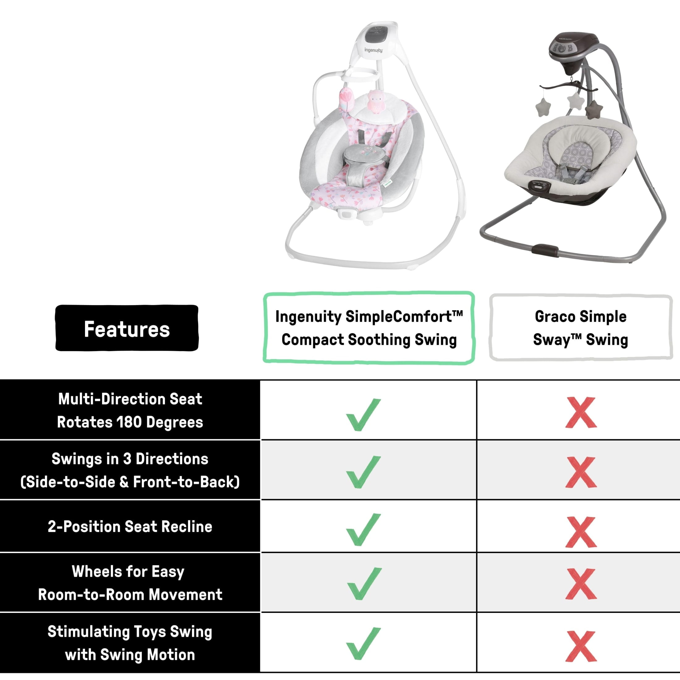 $103.19Original price was: $103.19.$85.99Current price is: $85.99.Ingenuity especially designed the SimpleComfort Compact Soothing Swing to make your day more simple and convenient, without breaking the bank! This innovative oversized seat with adjustable recline rotates 180 degrees to give you a better view of your little one, and baby can swing 3 different directions. The lightweight frame has wheels and an easy-to-pull handle which make it simple to move this full-size swing from room to room. A USB cord is included to save money on batteries (wall adapter NOT included). From the GentleTouch control panel, you can customize babys experience with soothing vibrations, 8 melodies, 3 nature sounds, and white noise. Alternately, WhisperQuiet technology allows baby to swing in silence. Get a few hands-free moments with a swing timer that can be set to 30, 45, or 60 minutes. TrueSpeed technology maintains 6 consistent speeds, even as baby grows. A mobile is adorned with 2 adorable plush characters to entertain baby while they are comfy in the soft fabrics. When things get a little messy, the seat pad is removable to toss in the washing machine. The cute gender neutral fashion will compliment the dcor of any home and is perfect for a girl or boy.