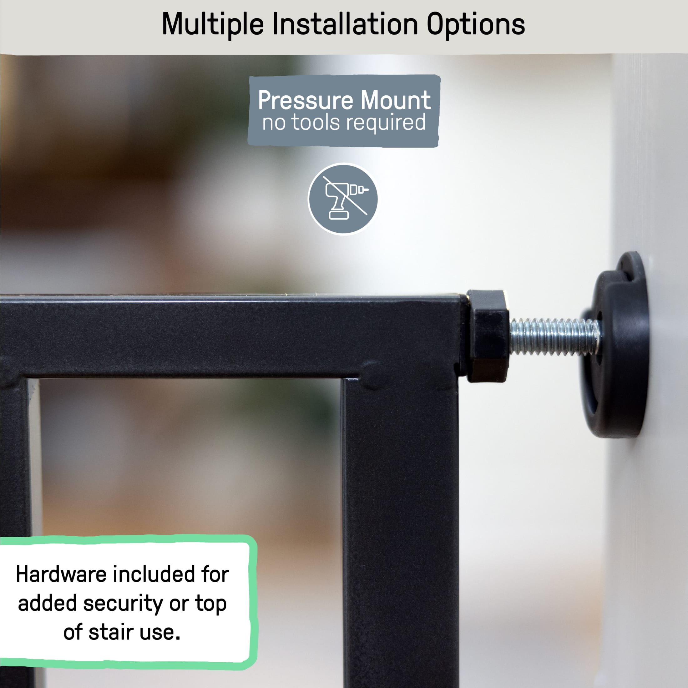 $68.79The Summer by Ingenuity Thruway 52W Series Baby and Pet Gate with exclusive GlideOpen technology makes moving through your baby-proofed home a breeze, even with your hands full. Choose between a traditional gate door opening with secure latch, or use the GlideOpen foot pedal if your hands are full. The dual action mechanism prevents babies or toddlers from using the foot pedal feature. This hands-free gate can be easily pressure mounted for secure use in doorways and between rooms, or hardware mounted for additional peace of mind with the included hardware kit (not made for stair use). Quickly adjust the width with 3 included extensions designed to work for openings from 24 wide to 52 wide. Ideal for containing kids and pets, with a door that swings both ways for added convenience. The modern espresso metal finish features a durable steel design and decorative arched doorway to safeguard your home in style. Summer by Ingenuity is leading meaningful innovation in baby/pet gates to make parents lives easier. Dimensions: 33 x 52 x 2.5. Door 17.25 wide. Note: Gate will appear as though the door is off-center when taken out of the package until you mount it into the doorframe and tighten the bolts according to instructions.