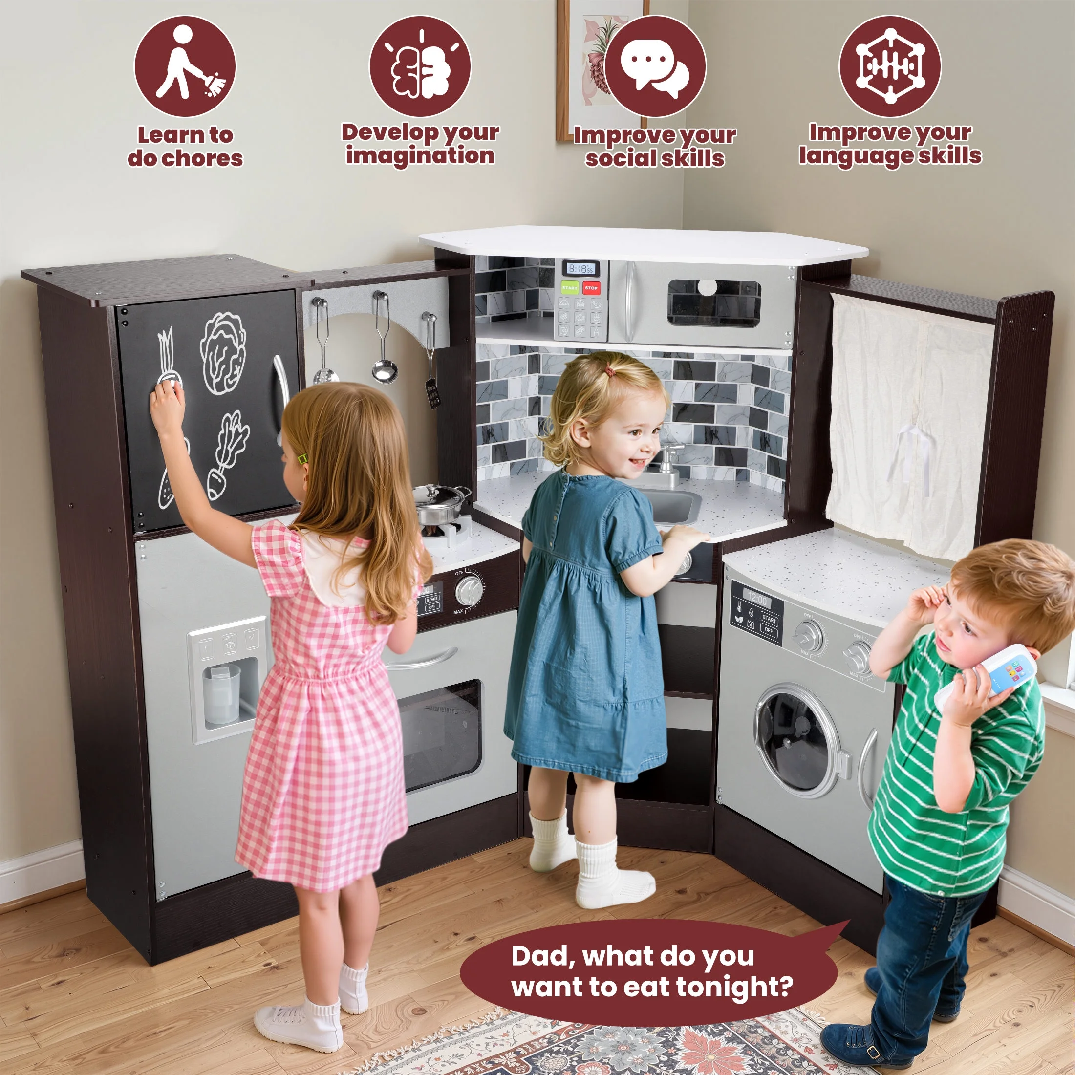 iYofe Corner Wooden Play Kitchen, Kids Kitchen Playset w/Light & Sound, Phone, Microwave, Stove, Cocina de Juguete Para Niña with Cooking Toys Accessories for Toddler Ages 3-5 Boys Girls, Espresso
