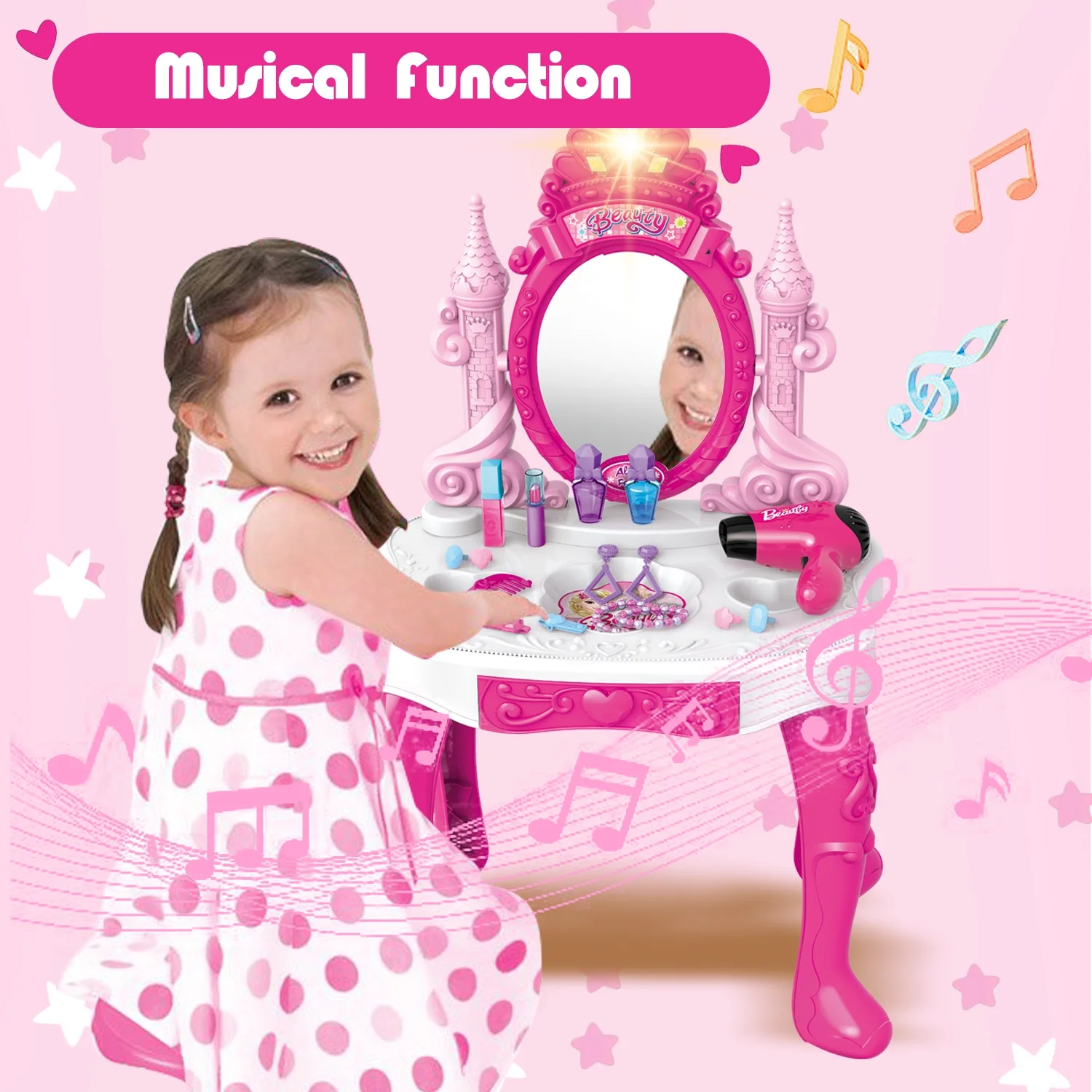 Jiakora Toddler Vanity Toy, Makeup Table with Mirror and Chair, Kids Pretend Play Vanity Set with Accessories and Lights and Music, Toy Gift for Girls 2-5 Years Old, Pink