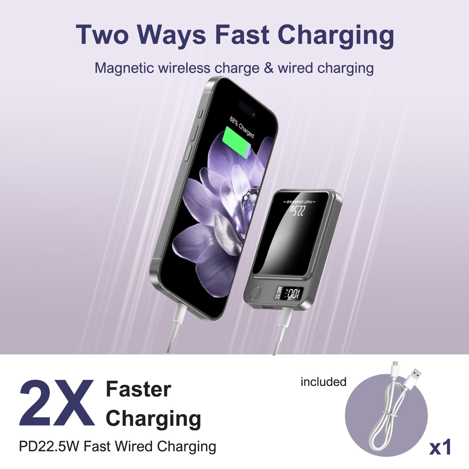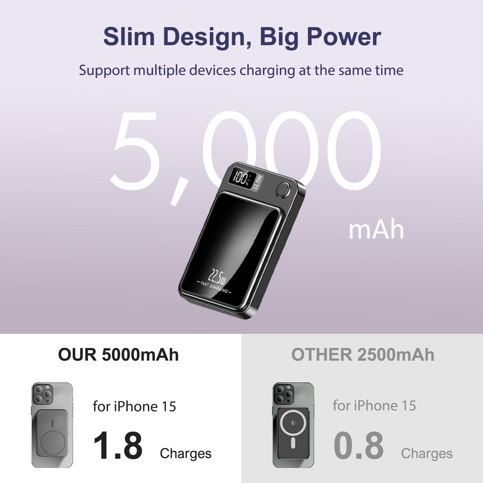 5000mAh 2-in-1 Wireless Power Bank with LED Power Display, Magnetic Portable Charger, Fast Charging 22.5W Battery Pack