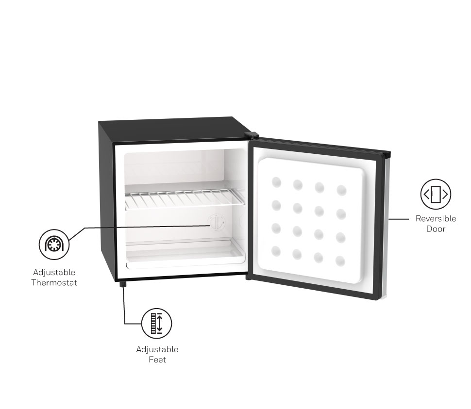 Adjustable thermostat Manual defrost Reversible door with adjustable legs.