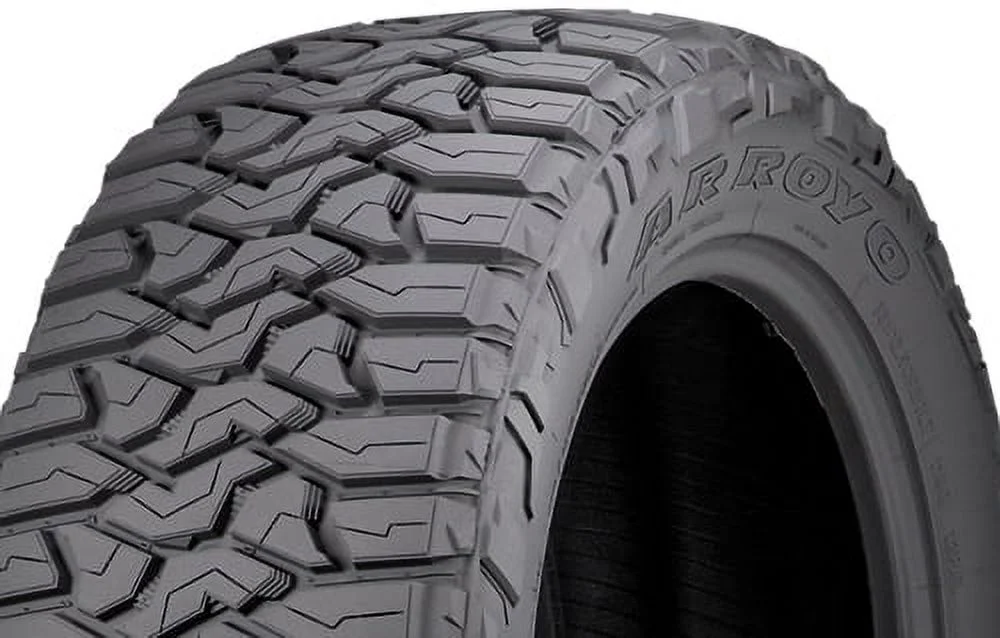 The Arroyo Tamarock R/T is a rugged terrain with all season tires made for light trucks. Arroyo offers a 55,000-mile treadwear warranty with this model. Excellent rugged terrain traction is provided with this tread design the strengthened structure and the durable rubber compound. The optimized tread elements also keep the footprint clean during the performance. This clean footprint enables the tire to boost its contact with the driving surface ensuring better steering responsiveness and driving stability. The Arroyo Tamarock R/T offers great damage resistance and driving durability as well.