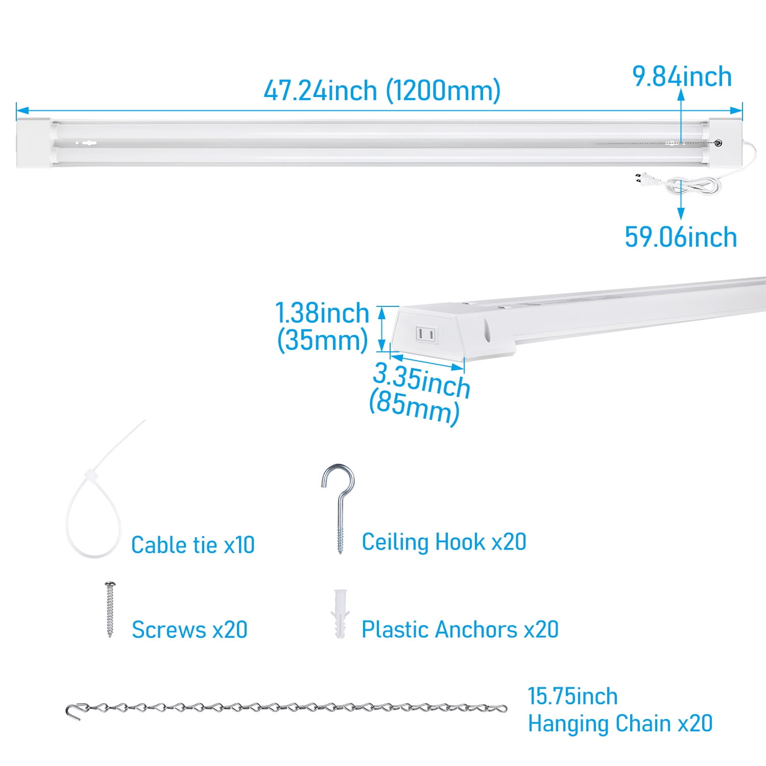 Low Power Consumption Despite its lower wattage, this 4ft LED shop light still delivers ample brightness. The 5000K natural daylight emitted is neither blue nor dazzling, ensuring a more pleasant and comfortable lighting environment for your work. Enhanced Reflective Design Our innovative deep reflector design offers superior performance by minimizing glare and reducing light loss. Additionally, it provides improved dustproof capabilities, protecting the lamp body and extending its lifespan for prolonged usage. Easy-to-Use Linkable Design Each light comes with a 59-inch power cord featuring a 1-15P plug, allowing you to effortlessly connect up to four lights using just one power supply. Our product comes with all the necessary accessories, making it easy for you to choose between surface mounting or suspended mounting according to your requirements. This versatility makes it perfect for various settings such as garages, stores, fast-food restaurants, gyms, and more. Certified for Safety and Quality ETL, FCC and ROHS listed, ensuring its compliance with rigorous safety and quality standards. Additionally, it comes with a generous 3-year warranty, providing you with peace of mind and assurance of its reliability. Specifications Wattage: 40W Voltage: 120V Luminous flux: 4000LM CCT: 5000K Daylight Lifespan: 35,000hrs Waterproof: Damp Working temperature: -4°F-104°F Dimmable: No Beam Angle: 115°