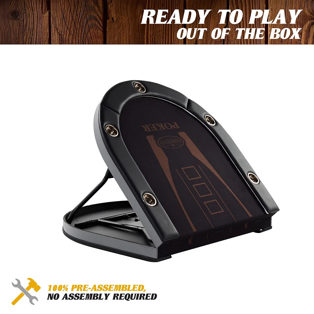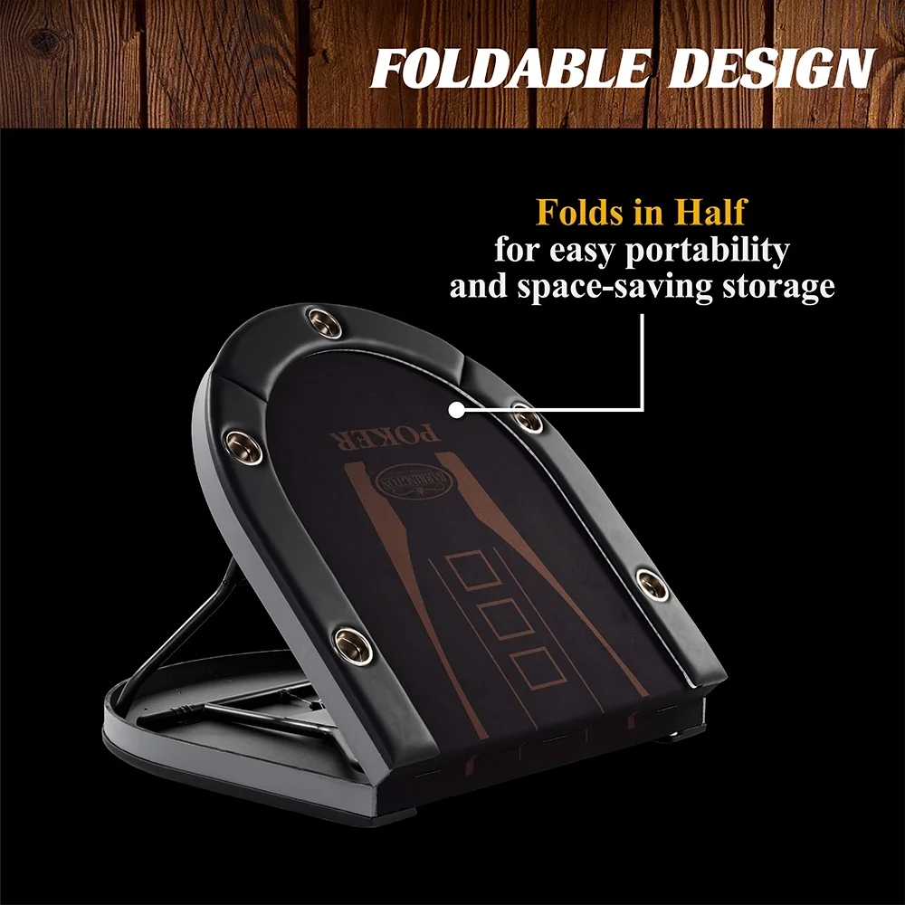 Enjoy a night with friends and family with the Barrington 10-Player Poker Table with In-laid LED Lights. It sets up in minutes to start dealing quickly. This poker table has a sleek design to help enhance the mood and feel just like a real casino. Use it for your next party or family event. It is designed for everyone to comfortably rest their forearms on the foldable poker table during a session. Built-in steel cup holders keep sweaty glasses and tumblers off of the felt surface without depriving guests of refreshments. This Barrington poker table makes it convenient to take action at your friend’s homes. It collapses in half for easy storage under your bed or loading into your car. The softcover features Texas hold appointments, but it works well for all of your favorite card and board games.