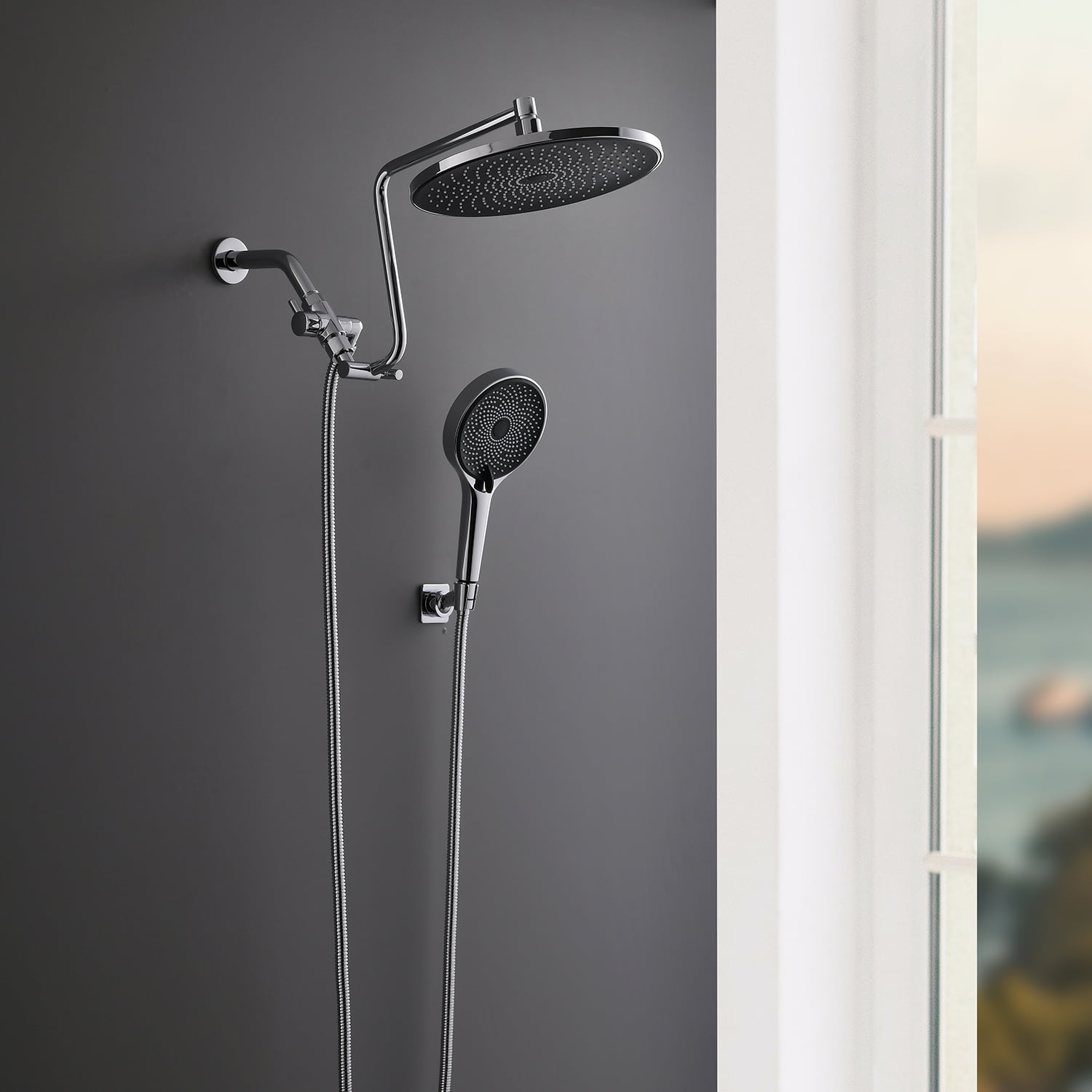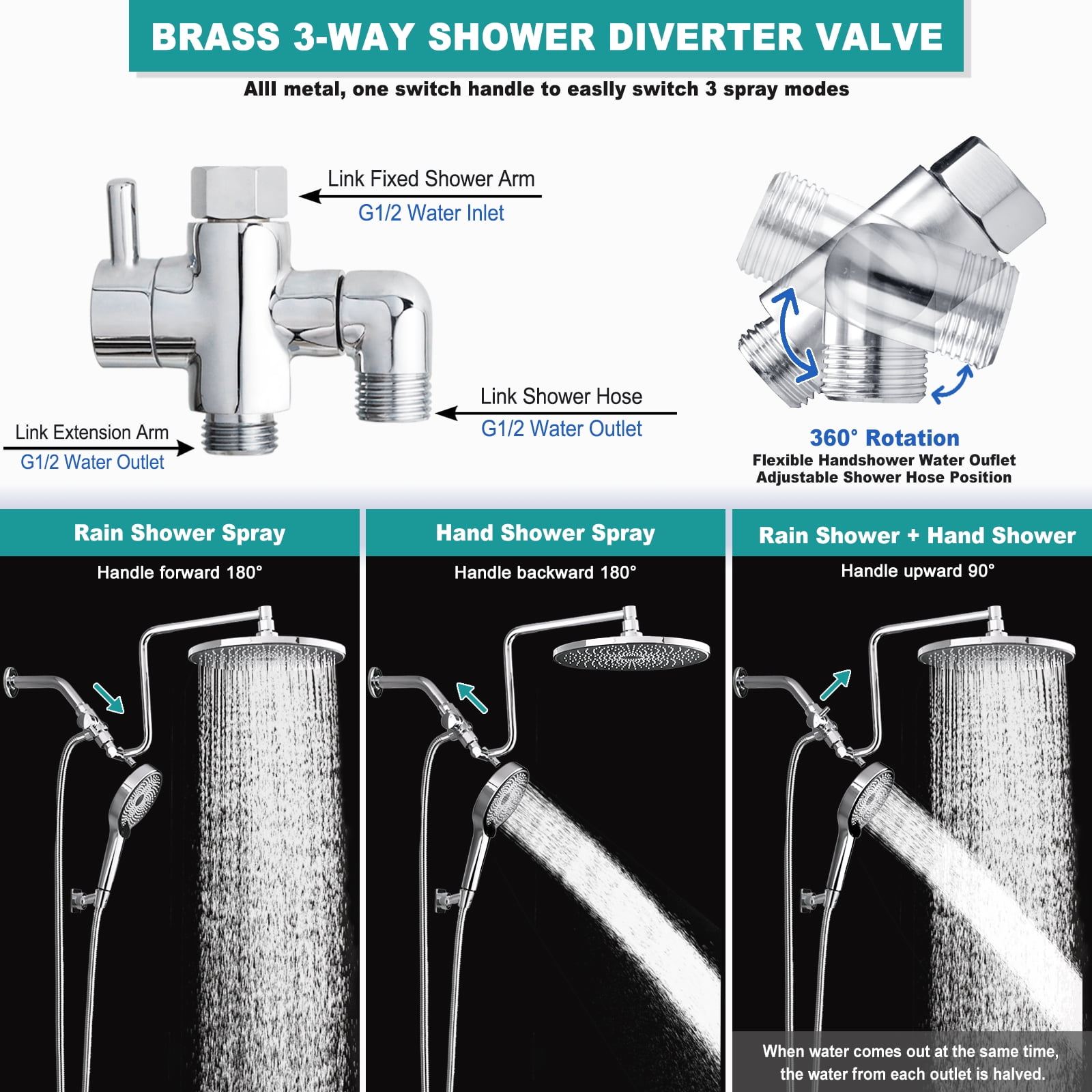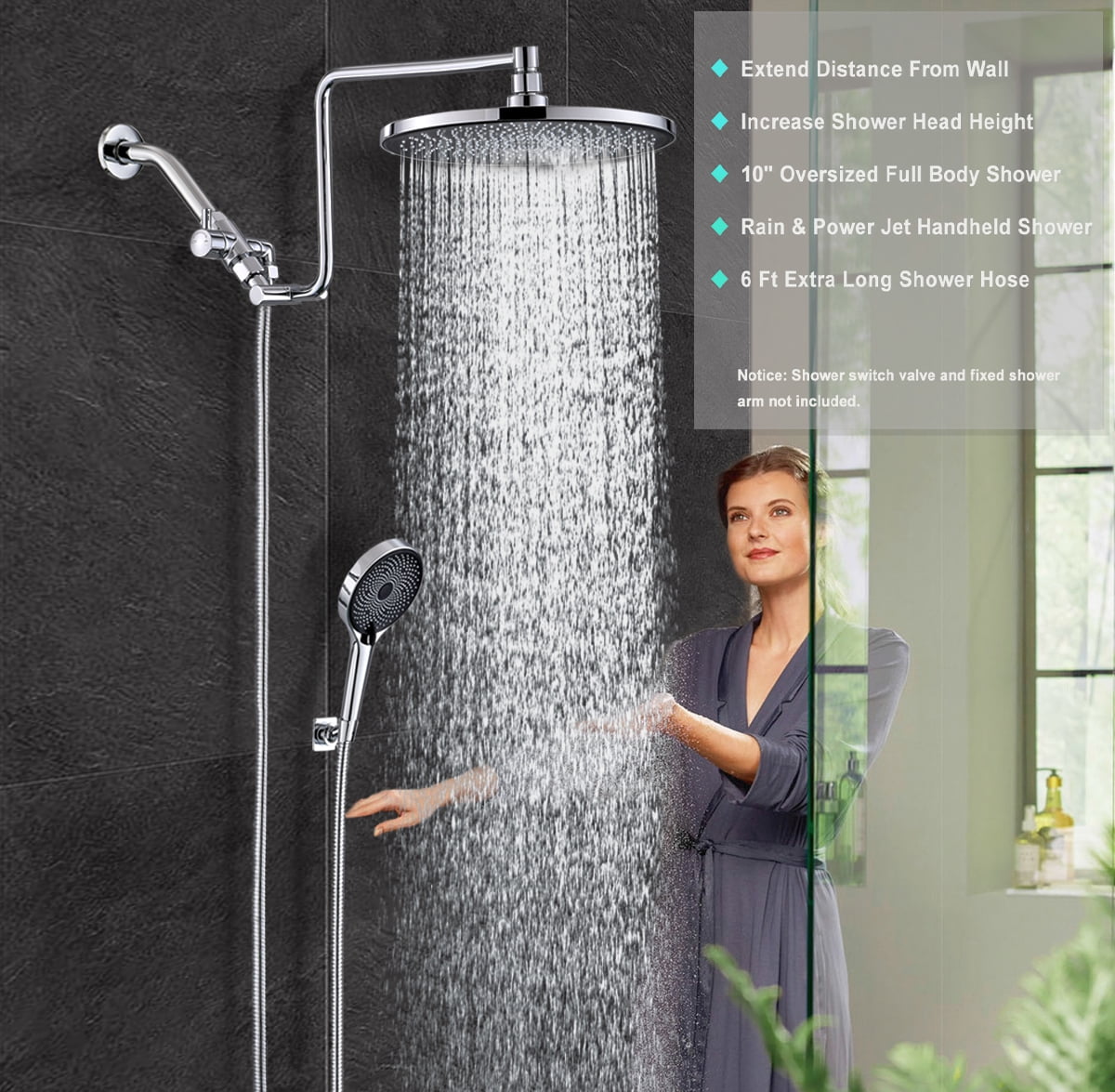 【Upgraded 12″ Extension Arm】: Z-shaped practical shower arm, height can be adjusted up and down, so that your large size shower head is always vertical and will not hit the shower arm, instead of sloping water like ordinary straight shower arms .Made of all metal, equipped with locking screws, not easy to fall. 【Shower Head Combo】: 10″ round ABS plastic shower head and 5″ ABS plastic hand shower, the super large panel gives you the perfect experience of showering under the waterfall. The ball joint that provides 360°rotation is made of brass. Compared with plastic ball joint on the market, ours are stronger and will not break or leak. The hand shower provides 3 spray modes, and the beautiful water effect makes you have a pleasant and relaxing shower.【Upgraded 3-Way Diverter Valve】: Made of solid brass, it can be used with a shower head/hand shower alone, or with two showers at the same time. The shower diverter has a large flow channel design with no water flow restrictions. The unique rotatable shower connector best solves the wrong angle of most handheld shower diverters to keep the hose sagging and prevent tangling in the shower. 【Solid Brass Shower Holder】: All metal, no plastic, 360°free rotation. Compared to plastics on the market that are prone to cracking and falling, our heavy duty, premium quality, waterproof and rust resistant, glue mounts will never fall off. It needs to be installed on a solid and smooth surface. Once installed, it can be easily rotated using the lever action of the hand shower. 【Installation & Accessories】: Easy to install, no plumber required. Use standard 1/2” pipe threads. The water saving tablets are already installed in the shower head and hand shower and can be removed as required. Comes with 71″ extra long shower hose, gloves, pipe sealing tape. Please read our instructions carefully before installation. If you have any questions, please feel free to contact us.
