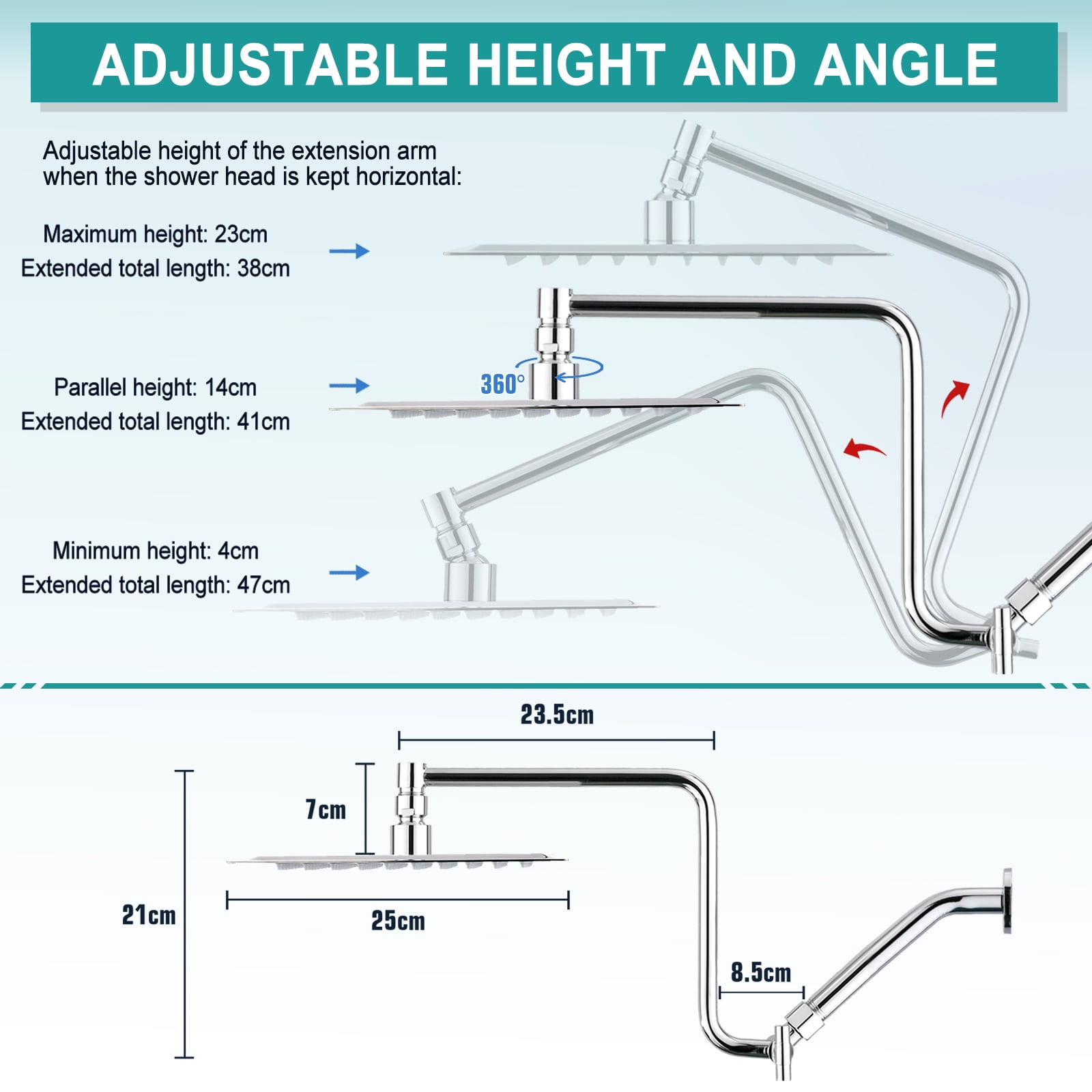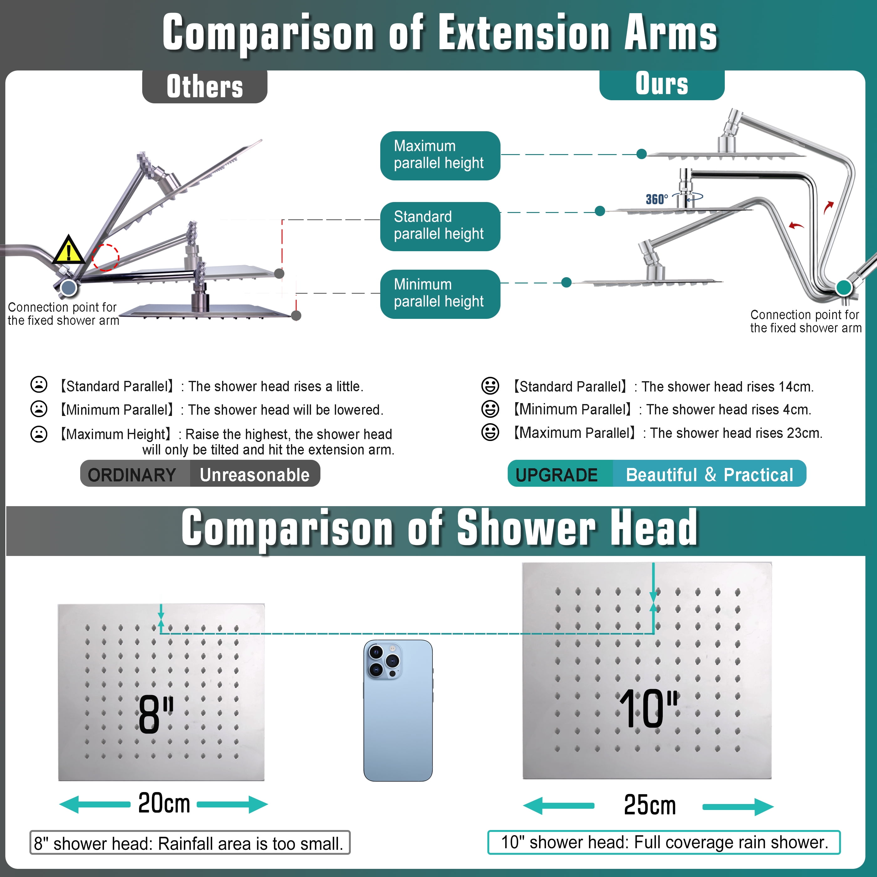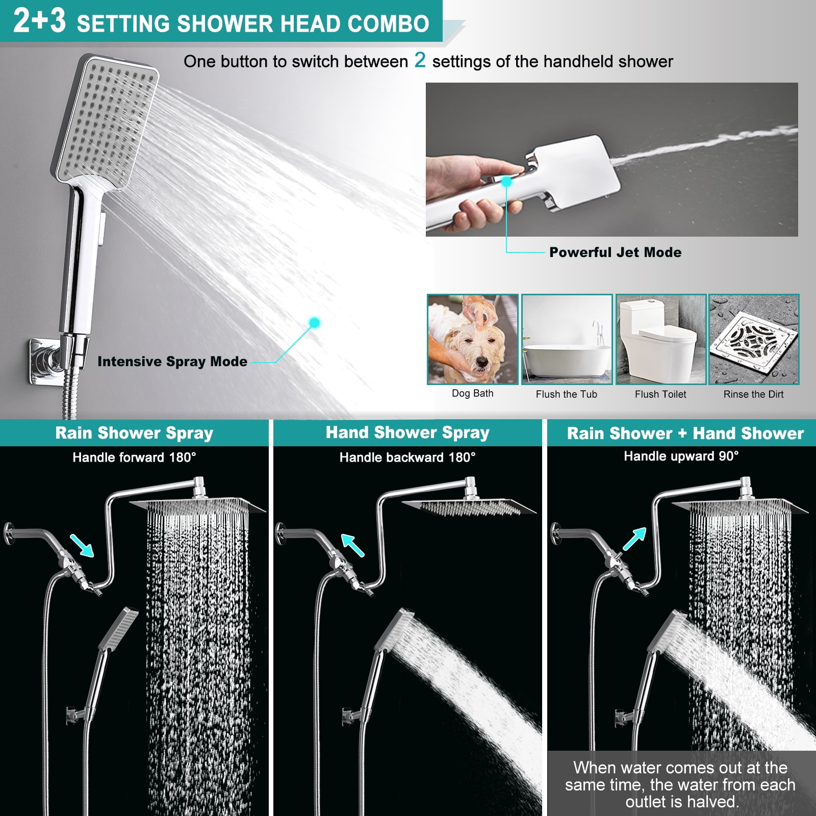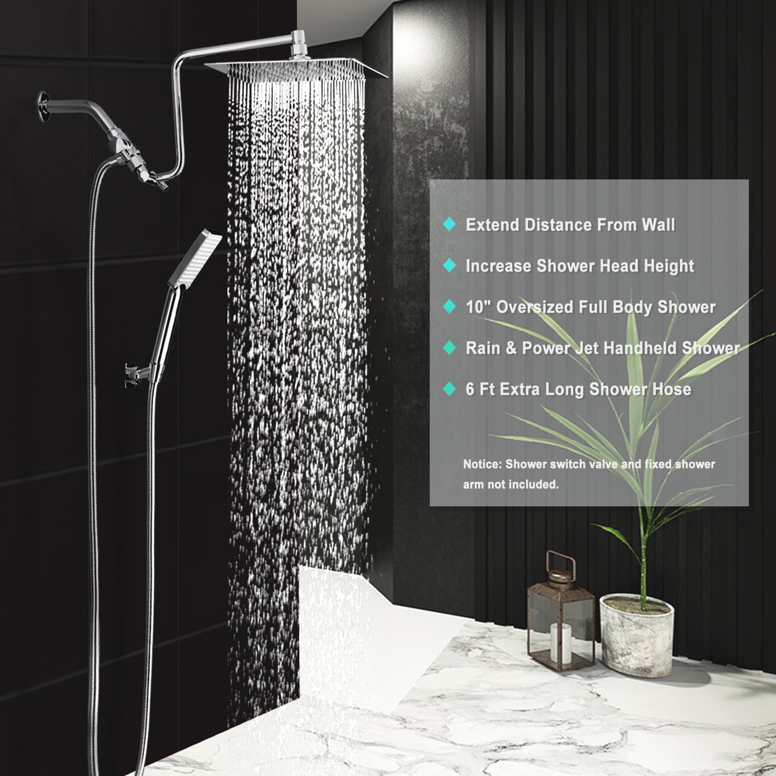 【Upgraded 12″ Extension Arm】: Z-shaped practical shower arm, height can be adjusted up and down, so that your large size shower head is always vertical and will not hit the shower arm, instead of sloping water like ordinary straight shower arms .Made of all metal, equipped with locking screws, not easy to fall.There is only one height-adjustable handle, reducing the possibility of additional leaks. 【Shower Head Combo】: 10″ square stainless steel shower head and square ABS hand shower, the super large panel gives you the perfect experience of showering under the waterfall. The ball joint that provides 360°rotation is made of brass. Compared with plastic ball joint on the market, ours are stronger and will not break or leak. The hand shower offers a regular shower pattern and a powerful jet, enough to clean the walls of a bathtub or shower.【Solid Brass Shower Holder】: All metal, no plastic, 360°free rotation. Compared to plastics on the market that are prone to cracking and falling, our heavy duty, premium quality, waterproof and rust resistant, glue mounts will never fall off. It needs to be installed on a solid and smooth surface. After installation, it can be easily turned using the lever action of the hand shower. 【Upgraded 3-Way Diverter Valve】: Made of solid brass, it can be used with a shower head/hand shower alone, or with two showers at the same time. The shower diverter has a large flow channel design with no water flow restrictions. The unique rotatable shower connector best solves the wrong angle of most handheld shower diverters to keep the hose sagging and prevent tangling in the shower. 【Installation & Accessories】: Easy to install, no plumber required. Use standard 1/2” pipe threads. The water saving tablets are already installed in the shower head and hand shower and can be removed as required. Comes with 71″ extra long shower hose, gloves, pipe sealing tape. Please read our instructions carefully before installation. If you have any questions, please feel free to contact us.