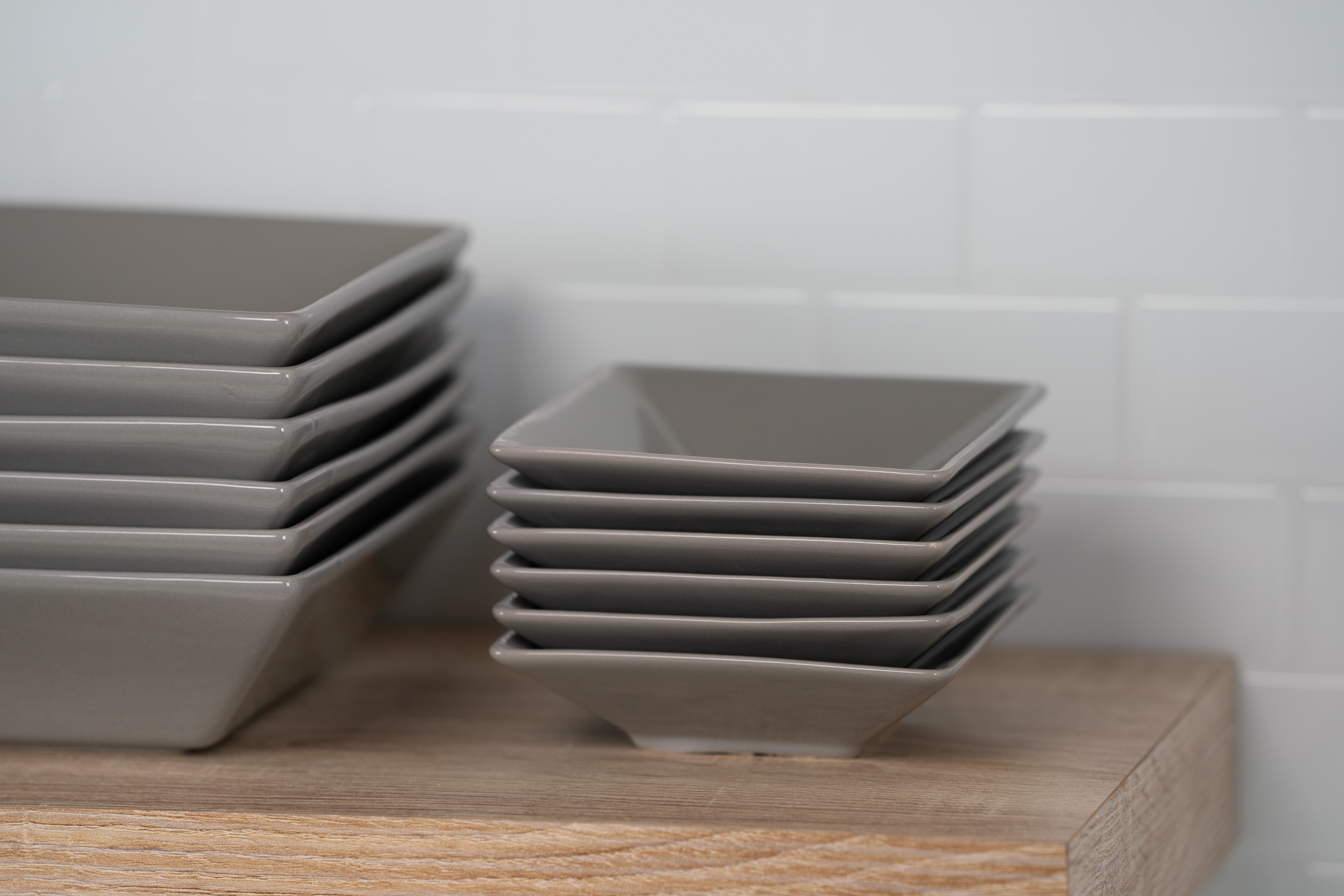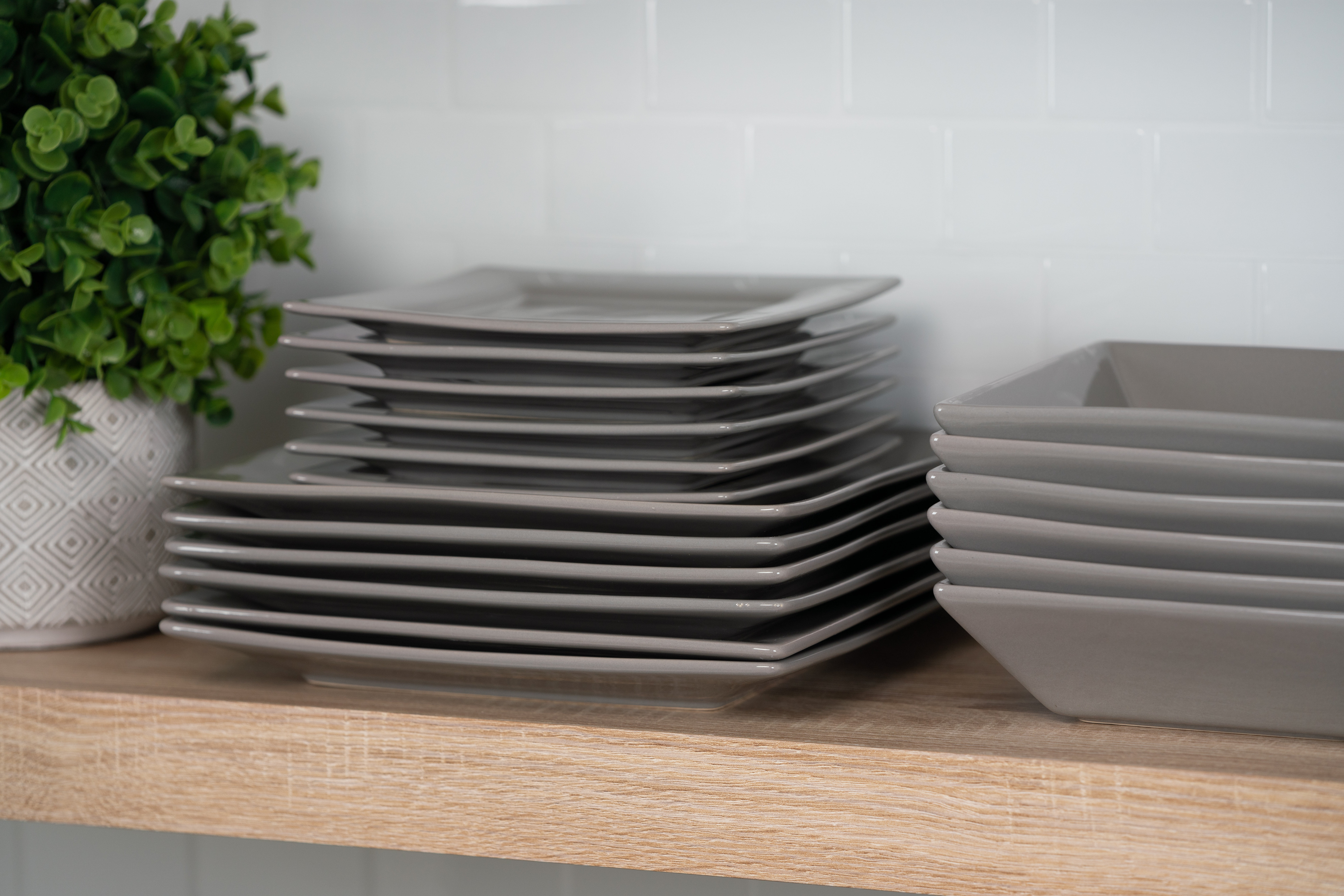 Upgrade your collection with the 10 Strawberry Street Nova Square Banquet 45-Piece Dinnerware Set in Glossy Cool Gray. This comprehensive set includes a full place service for six guests, plus all of the essentials needed for serving and more. The Ten Strawberry Street set includes dinner plates, salad plates, bowls, sauce dishes and mugs. Plus a large serving bowl, a rectangular platter, a butter dish with lid, salt & pepper shakers, a lidded sugar bowl and a milk creamer for a comprehensive table setting. The square dinnerware set creates a stunning table aesthetic with its contemporary square design. Suitable for oven-to-table use, each piece is made of durable stoneware and is microwave and dishwasher safe.