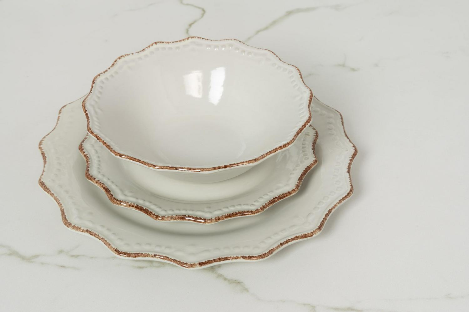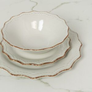 This charming dinnerware transitions gracefully from everyday use to unforgettable evening affairs. The Oxford collection supplies an attractive neutral compliment of Vintage ceramic pieces with beaded edging and a scalloped rim.