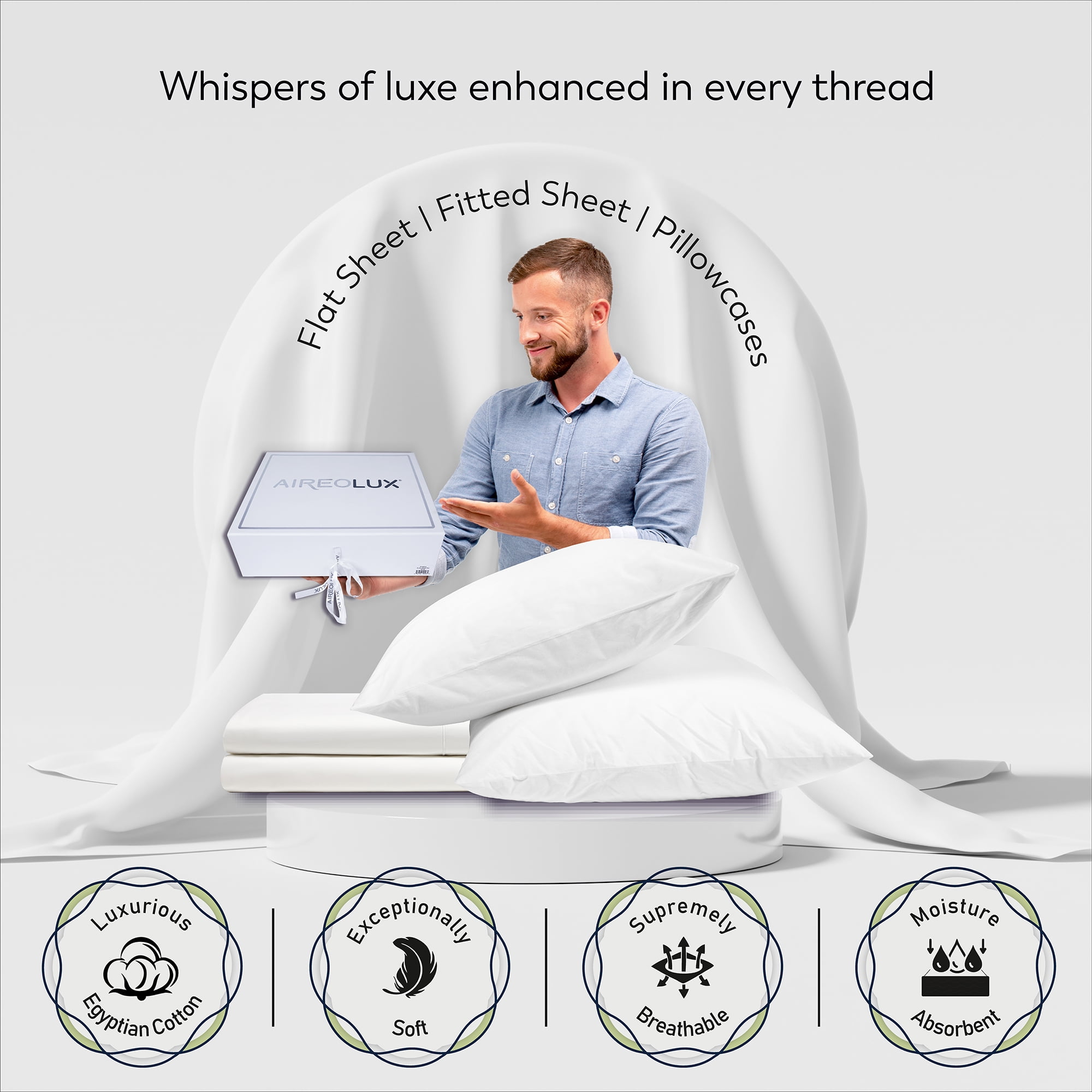 Key Features 1000-thread count coupled with supreme-quality Egyptian cotton oozes softness in every seam. Patented Infinity weave is super soft and breathable to keep you cool and dry all night long. Luxurious sheen and softness creates a feel that is both cool & comfortable True Grip fit technology for snug fit on mattresses from 7″ to 20″ deep pocket Fitted sheet comes with a head/foot tag for easy identification of the sides Pillowcases feature open-end closures to slip in and take out pillows effortlessly Certified by STANDARD 100 by OEKO-TEX® and National Sleep Foundation for credible safety and reliability Product set includes and dimensions as follows: Full size includes 1 flat sheet, 1 fitted sheet, & 2 pillowcases 01 Full flat sheet – 96 Inches x 86 Inches 01 Full fitted sheet – 75 Inches x 54 Inches 02 Standard pillowcase – 30 Inches x 20 Inches Queen size includes 1 flat sheet, 1 fitted sheet, & 2 pillowcases 01 Queen flat sheet – 104 Inches x 94 Inches 01 Queen fitted sheet – 80 Inches x 60 Inches 02 Standard pillowcase – 30 Inches x 20 Inches King size includes 1 flat sheet, 1 fitted sheet, & 2 pillowcases 01 King flat sheet – 104 Inches x 110 Inches 01 King fitted sheet – 80 Inches x 78 Inches 02 King pillowcase – 40 Inches x 20 Inches Aireolux invites you to celebrate love, luxury, and comfort like never before!