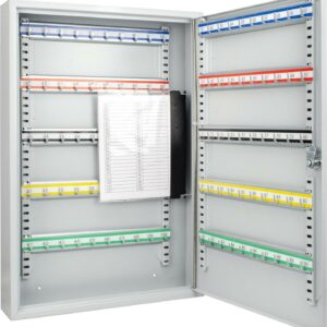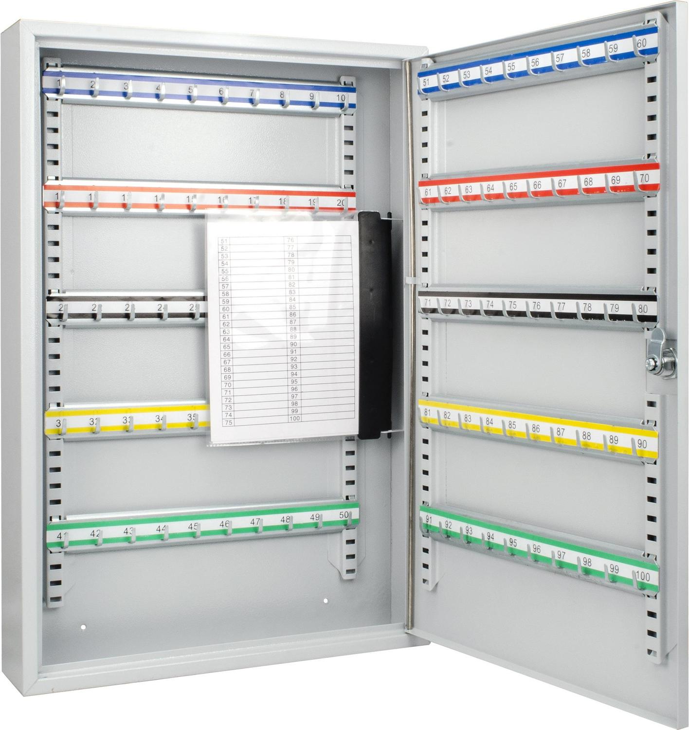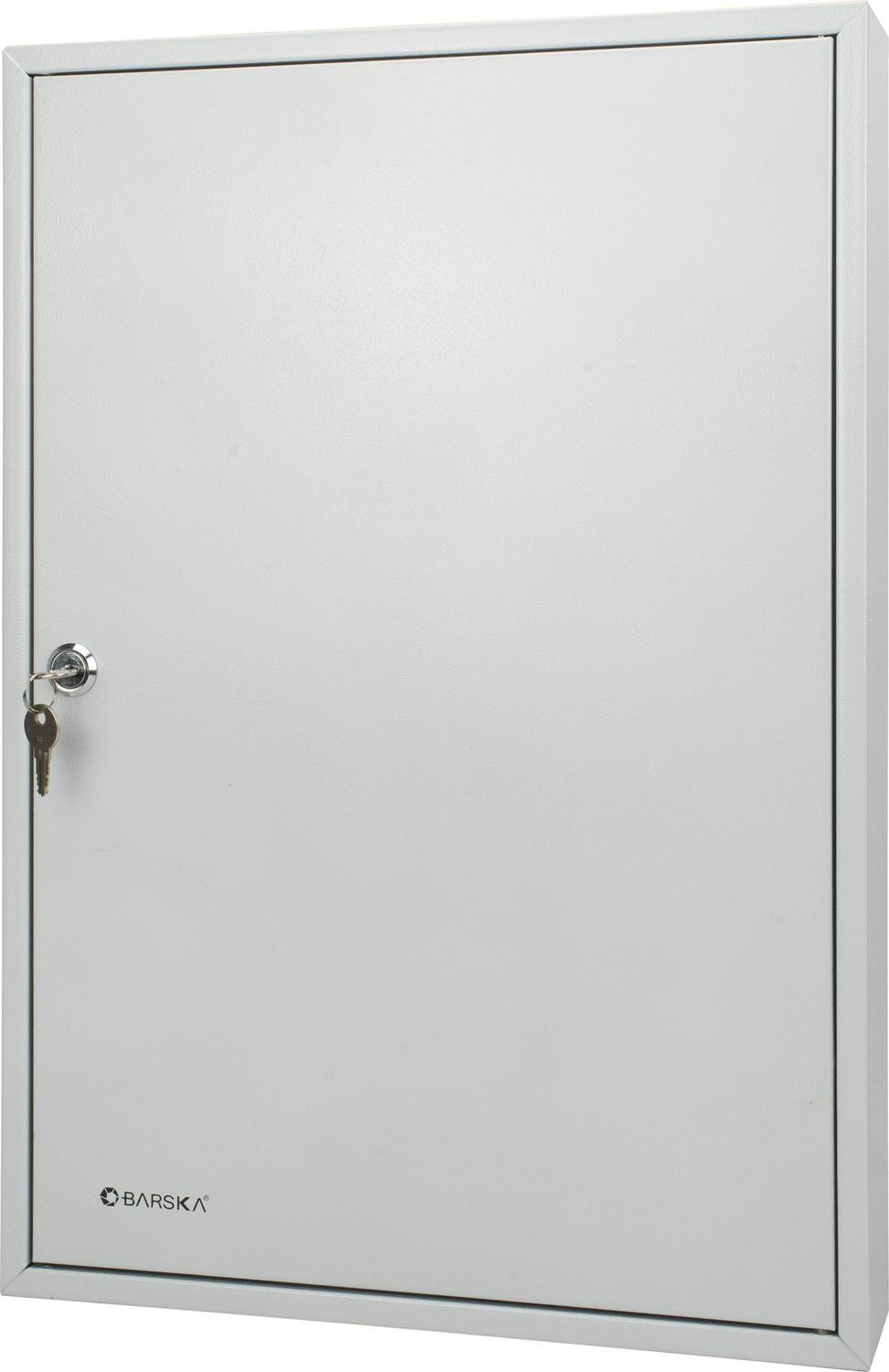 The 100 Position Key Lock Box from Barska features a hook-style cabinet that makes key organization easy and convenient. Inside the cabinet are five rows of color-coded and numbered hooks, each of which is easy to access and keep track of thanks to the included key index. The two-sided indexing chart has ample room to document the keys hook position corresponding lock, and a drop-in plastic sleeve tethered to the hinge inside the safe provides a hands-free reference.The safe has our pre-drilled mounting holes and included hardware for installation.The safe walls and door are constructed of 0.8mm solid steel and finished with a gray coating. Features: 100 Numbered Key Hooks Labeled Key Shelves Key Log Sheet 100 Colored Key Tags Mounting Hardware Lock Box Keys Outer Size (LxWxH): 14.75 inch x 3 inch x 21.75 inch