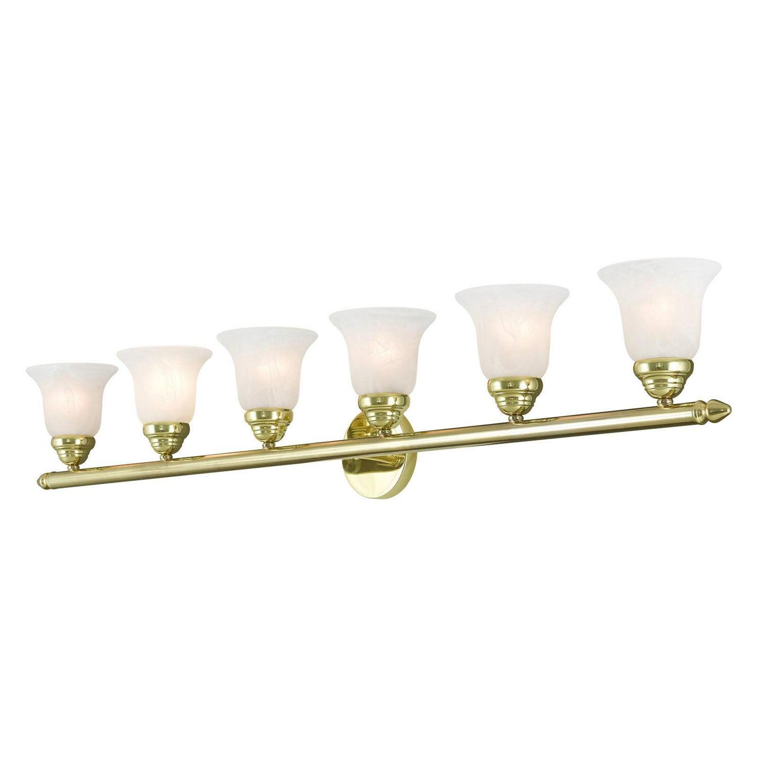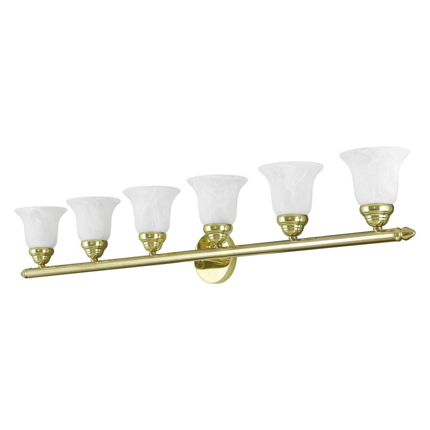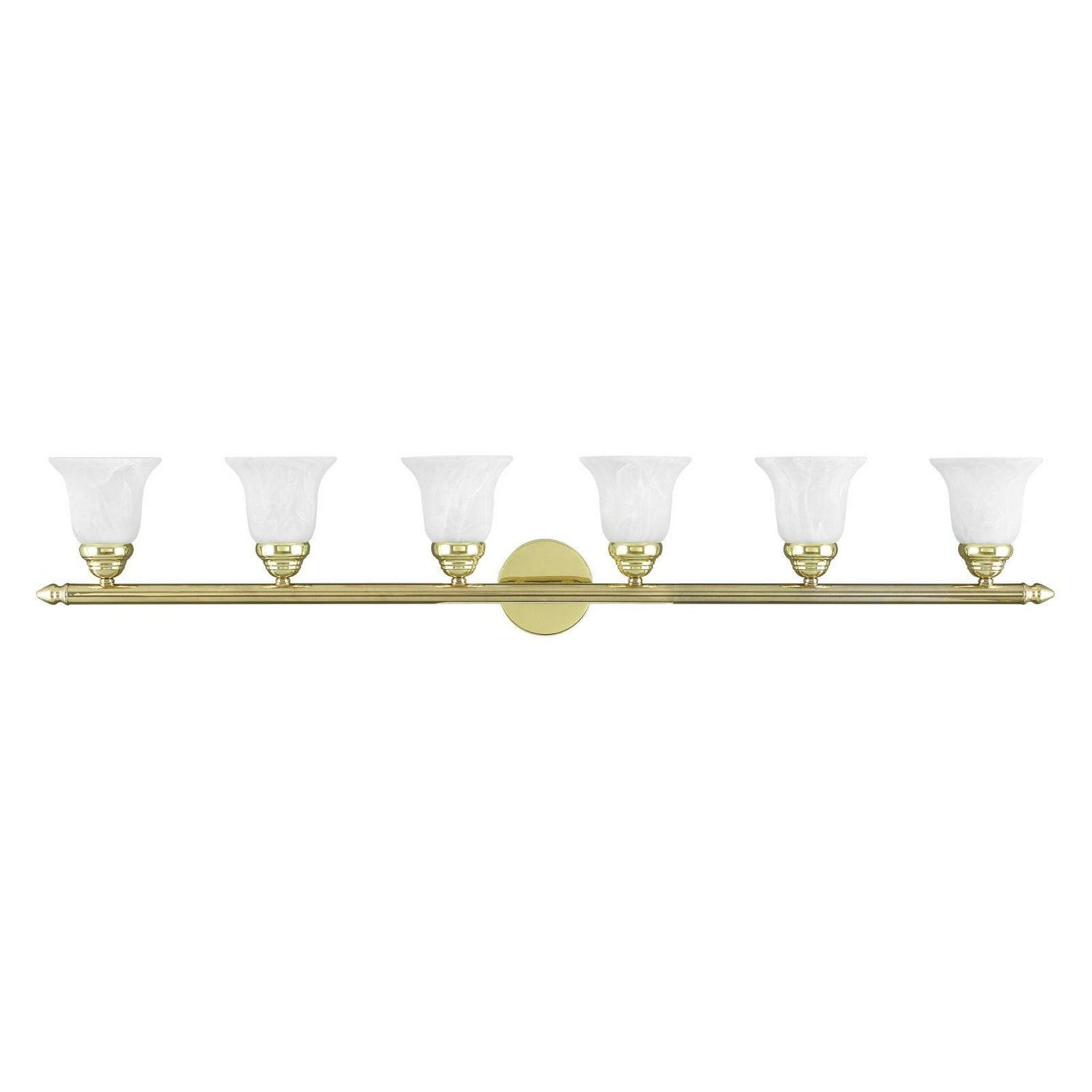 Livex Lighting-1066-02-Collection: Neptune, Material: Steel, Finish Color: Polished Brass, Width: 48″, Height: 8.63″, Depth: 6.75″, Height From Outlet Box: 5.5″, Backplate Width: 4.75″, Lamping Type: Incandescent, Number Of Bulbs: 6, Wattage: 100 Watts, Moisture Rating: Dry Rated, Desc: This clean and classic bath fixture design is ideal for bringing a bright new style to your bathroom space. It features a polished brass finish along with white alabaster glass.,-Neptune – 6 Light Bath Vanity in Traditional Style – 48 Inches wide by 8 Inches high-Polished Brass Finish