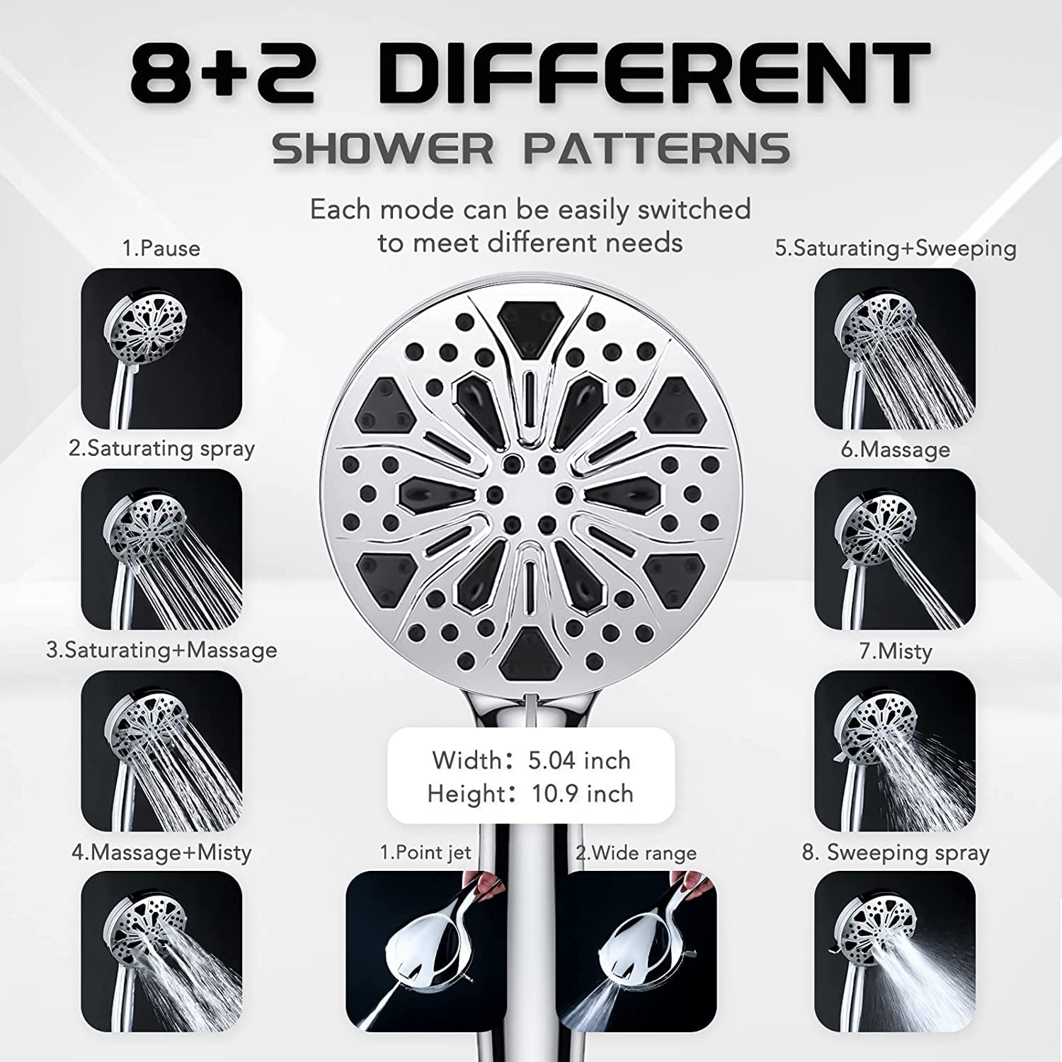 10”Rainfall Shower Head with Handheld Combo High Pressure 8+2 MODE built-in power wash, Stainless Steel with Chrome Showerhead with 11” Extension Arm Height/Angle Adjustable with Holder&60″Hose