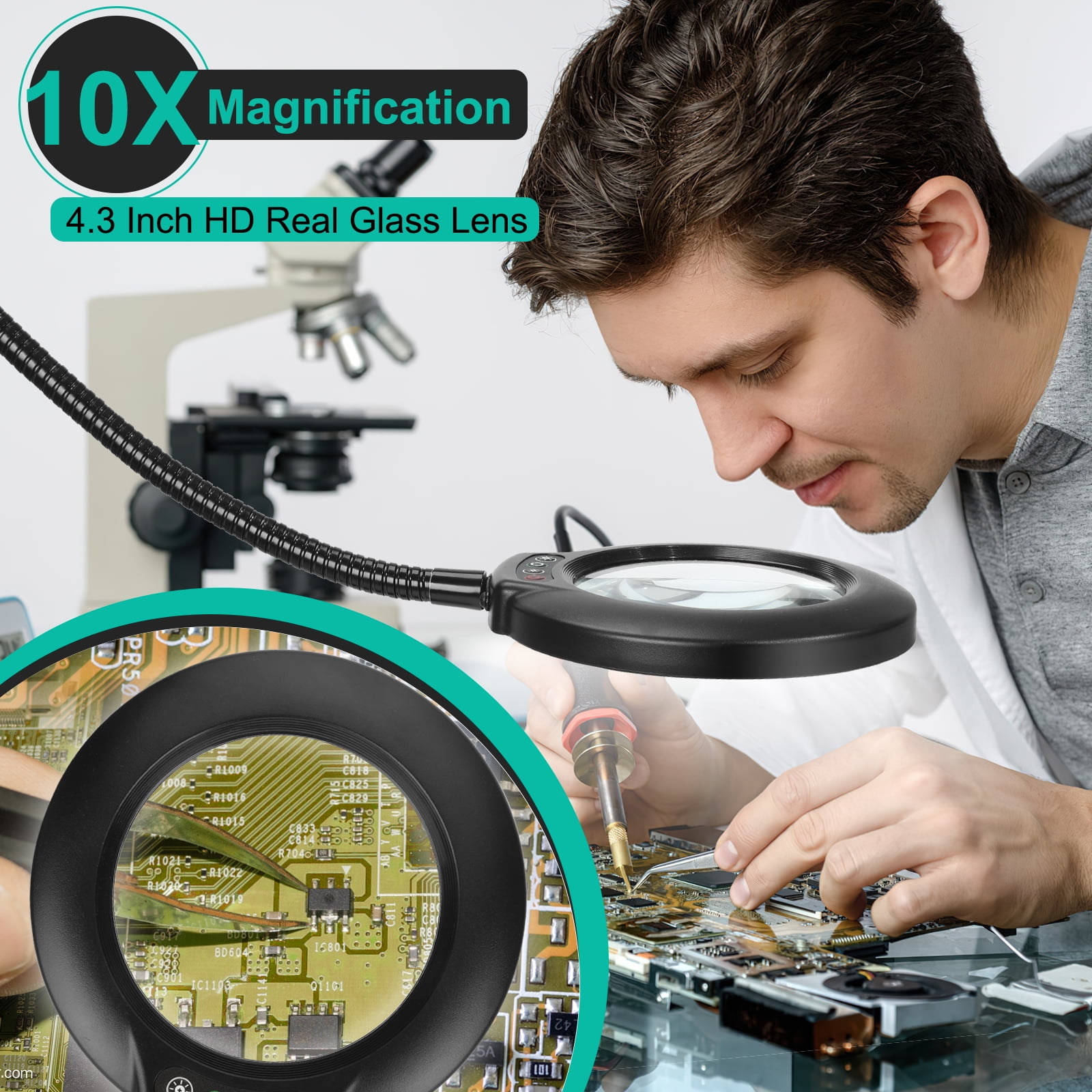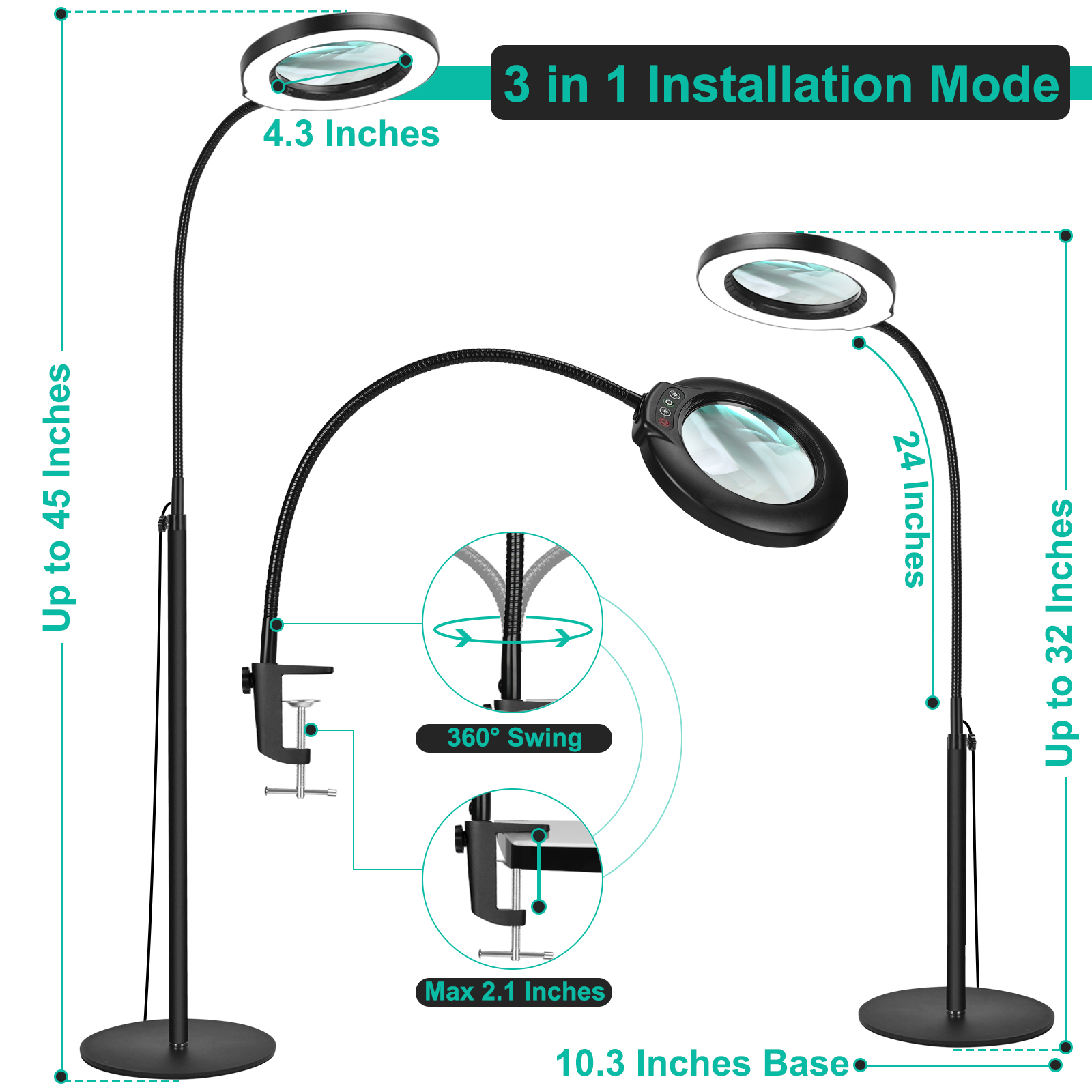 10X HD Real Glass Lens: This magnifying floor lamp is equipped with a 1000% magnification and HD real glass lens. The 4.3-inch optical-grade lens features high clarity and low distortion, ensuring image clarity while providing superior visual assistance. Whether you are elderly or visually impaired with macular degeneration, with this magnifier, you’ll be able to effortlessly read challenging tiny texts, effective relief of visual fatigue caused by prolonged use. 5 Lighting Modes & Stepless Dimmable: The Ring LED light source used in this magnifying floor lamp is designed to be easy on the eyes, without any glare or flickering to provide you with 5 adjustable color temperatures and stepless dimming from 5% to 100% brightness. Whether you’re looking for a cozy light to read or a bright light to work, it has got you covered. That will be a perfect choice for an architect, artist, beautician, collector, esthetician, jeweler, pharmacist, sculptor, sculptor. Top Button for Simple Control: Say goodbye to the hassle of searching for the power line control switch on the floor. Our latest design features a lamp head button switch, and adjusting the lighting settings while performing tasks is effortless. Lighted magnifier hands-free allows you to fully immerse yourself in intricate circuit boards or electronic equipment repairs, without needing to hold the magnifier with another hand. Enjoy the utmost working convenience with our LED magnifying light. 24-Inch Flexible Gooseneck: Unlike other smaller-size counterparts, our 24″ extra-long gooseneck magnifying glass with light and stand has a more extensive reach. Crafted from premium aluminum, the gooseneck smoothly adjusts to any desired angle and is firmly in place without annoying metal noise. It is a must-have tool for artistry, close work, engravings, jewelry design, knitting, needlework, puzzles, reading, repairs, soldering, and sketching. 3-in-1 Magnifier & Clamp Light: The floor lamp equipped with a weighted 10.3-inch metal base, ensures the lamp body stability during use. The detachable metal pole supports two different heights to adjust without the need for any tools. It can also function as a clamp lamp. The metal clamp securely attaches the light to workbenches, tables, or any flat surface up to 2.1 inches thick. Its convenient features will become the ultimate solution for craft, eyelash extensions, facials, nails, or spas.