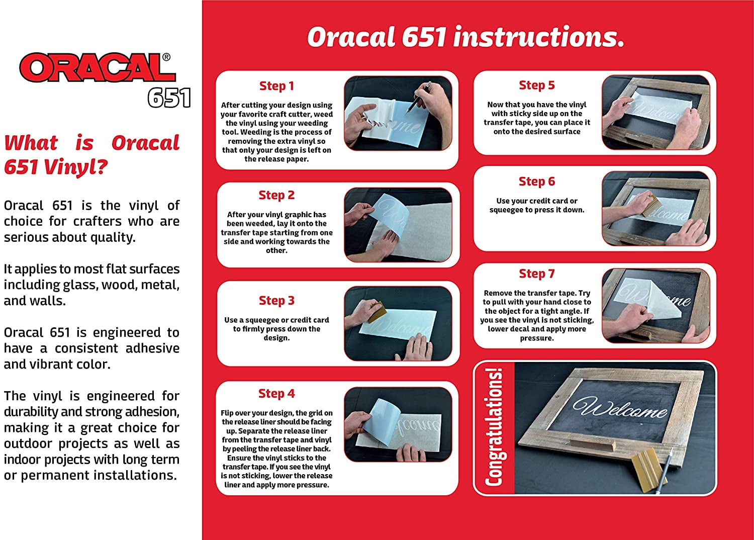 High quality Oracal 651 Craft Vinyl Roll Perfect for Crafting Oracal 651 vinyl is perfect for your crafting needs. Oracal film is compatible with all craft cutters, including the Cricut, Silhouette, Xyron, Craft ROBO, Graphtec, and more. It is a intermediate calendared vinyl, measuring at 2.5 mils in thickness. Manufactured in the United States, this is a high quality vinyl with consistent results. Easy to weed and durable, Oracal 651 is ideal for use on tumblers, window decals, car decals, signs, stencils, scrapbooking, or any other permanent application with a semi-smooth surface. The repositionable, pressure-sensitive adhesive means the media can be moved during a dry application and lightly repositioned it until it’s just right. This vinyl has a gloss finish that truly stands out from the competition. Features The vinyl comes on a 2.5″ diameter core, making for easy storage and reduced damage during shipping – All rolls are heat sealed Includes full color instruction sheets Finish: Glossy Rated for 5 years outdoor durability Waterproof Handwash safe Compatible with all craft cutters: Cricut, Silhouette, Xyron, Craft ROBO, Graphtec, and more Adhesive: Solvent-based, Permanent Roll Size: 12″ x 50′