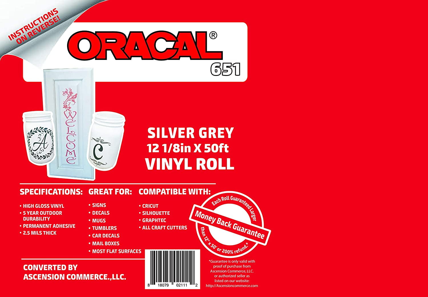 12.125″ x 50ft Roll of Oracal 651 Silver Grey Craft Vinyl – On a 2.5″ Core – Adhesive Vinyl for Cricut, Silhouette, and Cameo Cutters – Gloss Finish – Outdoor and Permanent