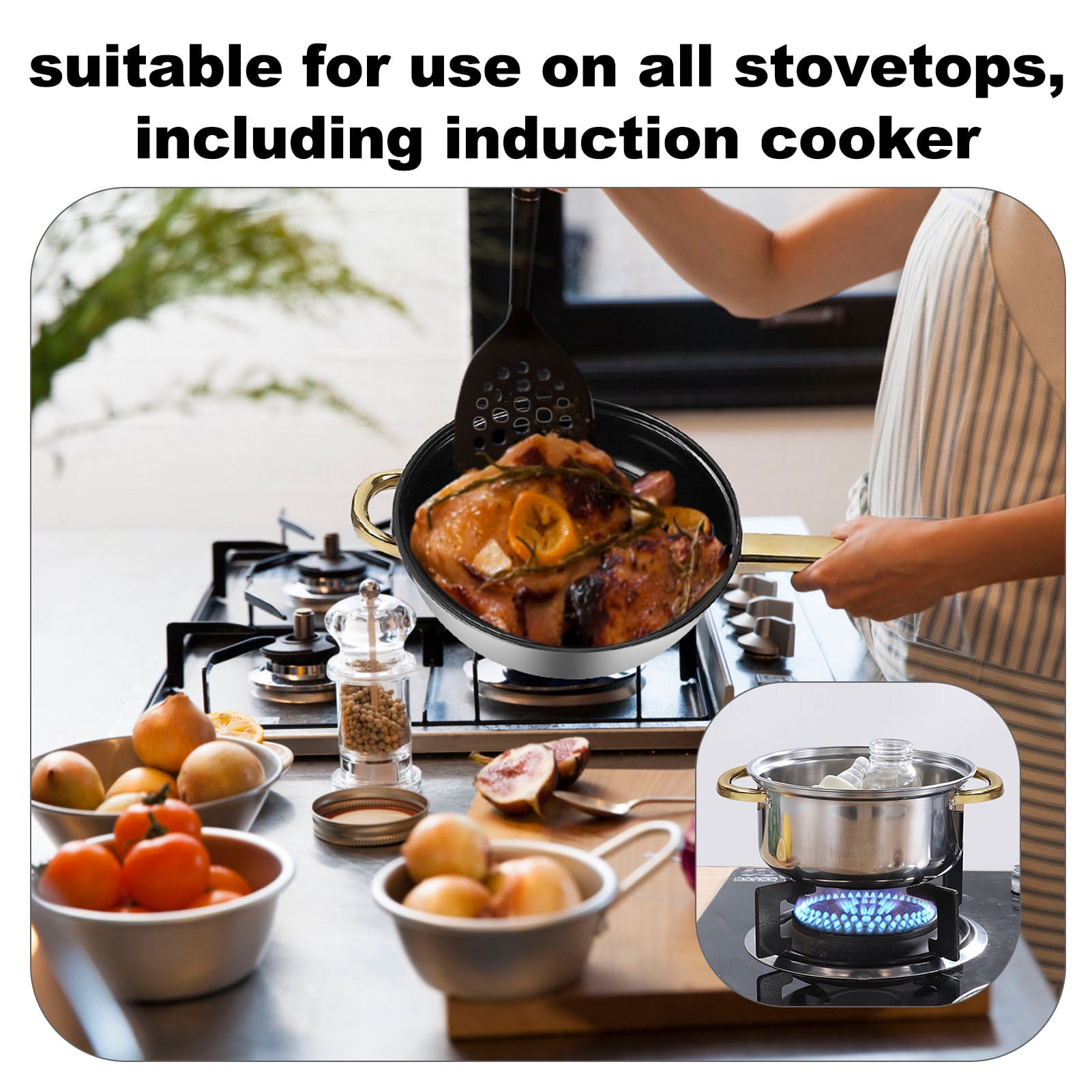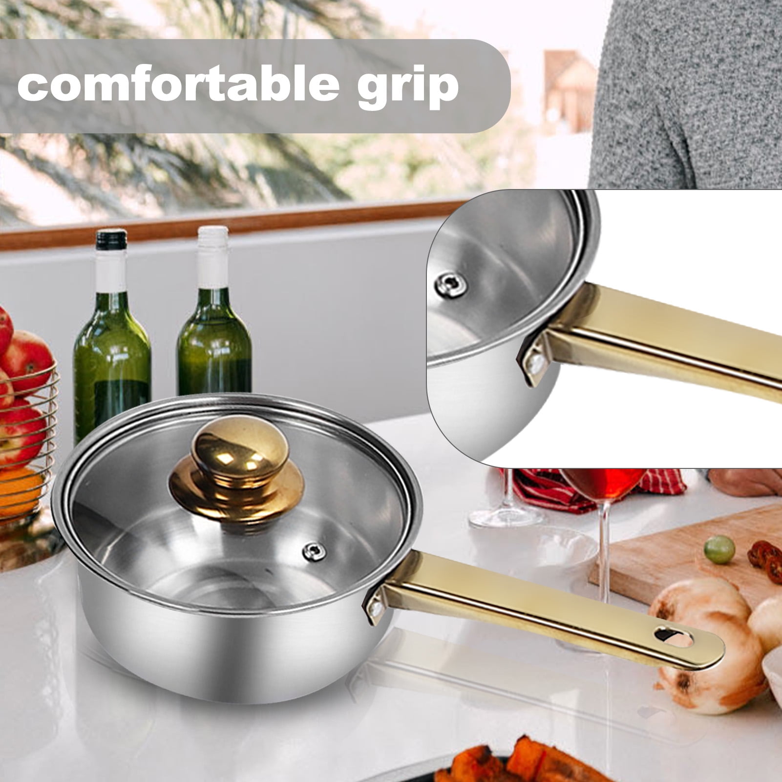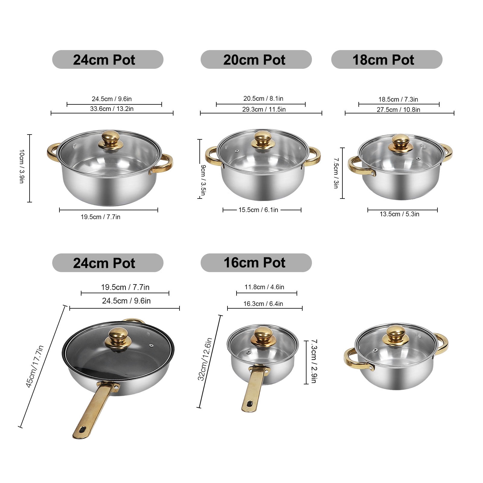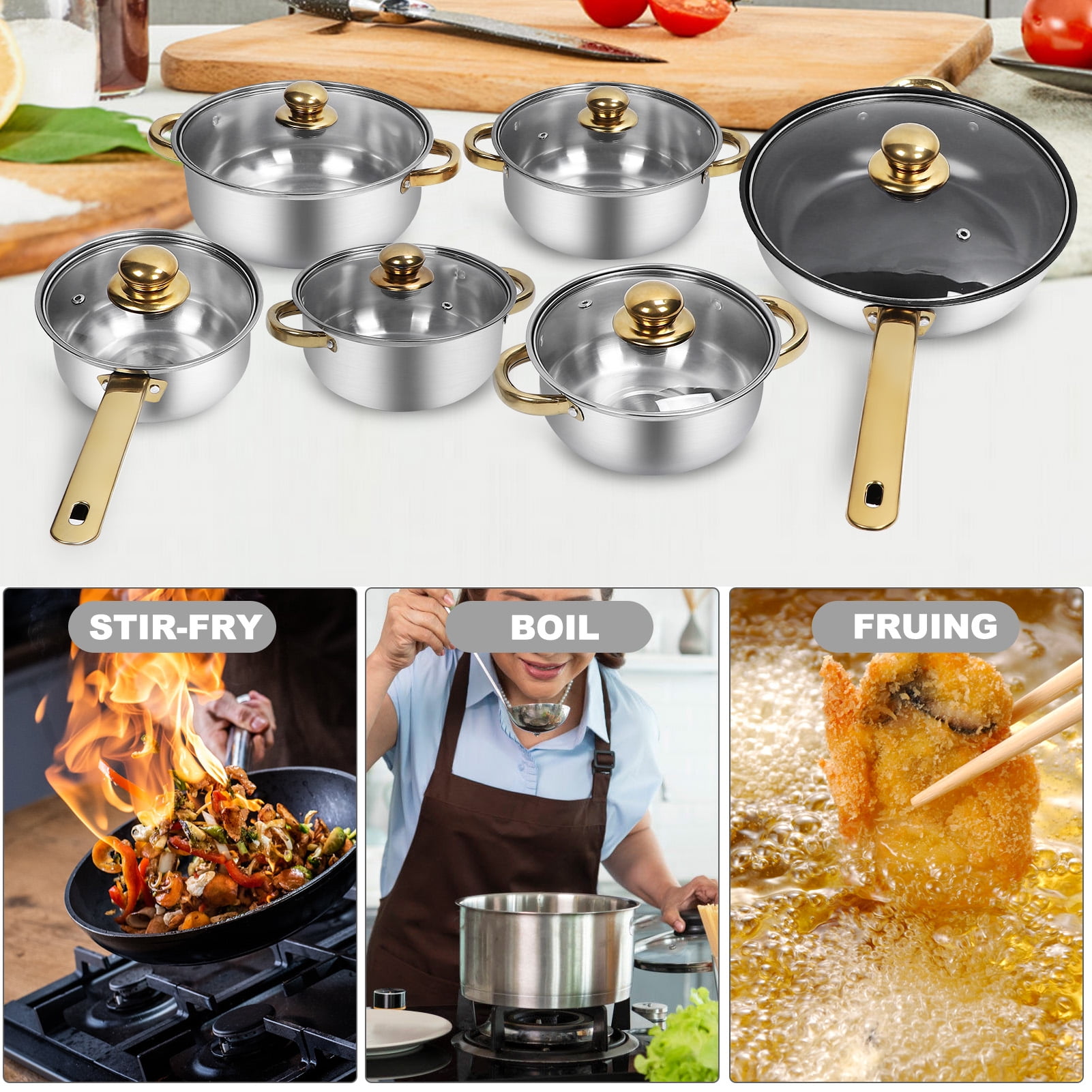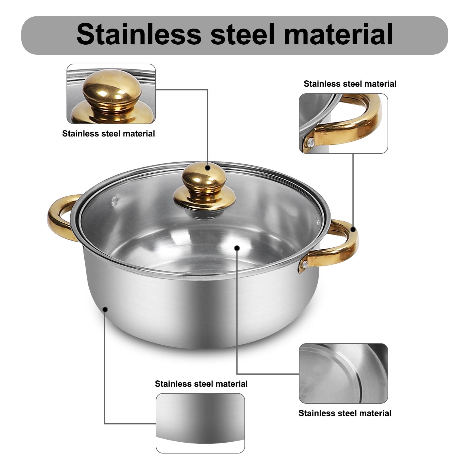 STAINLESS STEEL MATERIAL: Cookware set, made of premium stainless steel, high temperature resistant and not easy to deform, easy to clean and not easy to rust, durable and reliable. FULL SET OF POTS AND PANS: Multi functional kitchen cookware set, contains various sizes and types of pots and pans, such as frying pan, saucepan, soup pots, etc, to meet a variety of cooking needs. ELEGANT AND STYLISH: Stainless steel cookware set, gold handle design, stylish and generous, add kitchen decoration and taste, suitable for most home kitchen use. ENERGY EFFICIENT: These stainless steel pot pan set has powerful heat transfer performance, saving cooking time and energy consumption, so you can enjoy the preparation of delicious dishes. STOVETOP APPLICABLE: Our cookware is suitable for use on all stovetops, including induction cooker. The bottom design heats up quickly and evenly for your cooking experience. Specification: Item Type: Cookware Set Material: Glass, Stainless Steel Package List: 6 x Pot 6 x Lid 5 x Handle 5 x Handle Decorative Cover 5 x Screw 5 x Gasketor5 x Pot 5 x Lid 1 x Kettle 5 x Handle 5 x Handle Decorative Cover 5 x Screw 5 x Gasket Note: Manual measurement, please allow some errors.