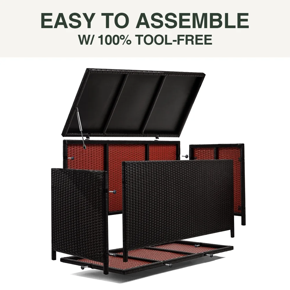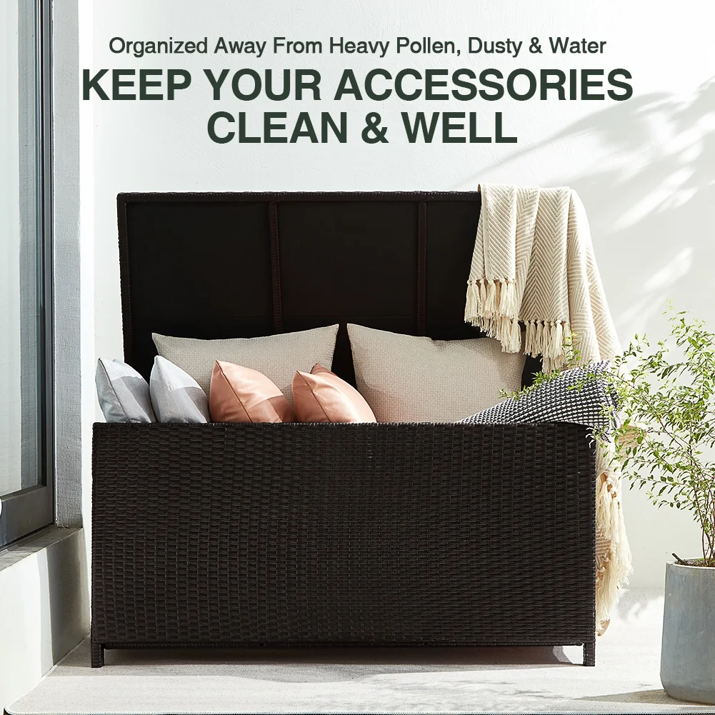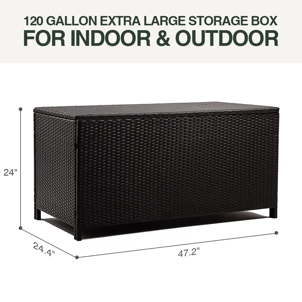 Large 120-gallon storage capacity Resin material prevents rusting, peeling, and denting, unlike real wood Easy lift and soft-close mechanism for effortless opening and closing Requires minimal maintenance to keep in top condition, suitable for kids’ use without the risk of smashed fingers The Storage deck box is designed to offer ample storage space, boasting a generous capacity of 120 gallons. This spacious interior provides plenty of room to store your outdoor cushions, gardening tools, pool accessories, and more, keeping them protected from the elements. The Storage deck box is constructed using rattan material, guaranteeing a durable product with UV protection. This product equips a feature of resistance to mold and water, and adverse weather conditions, ensuring a long lifespan for your outdoor storage solution. Product Dimensions L47.2″xW24.4″xH24″