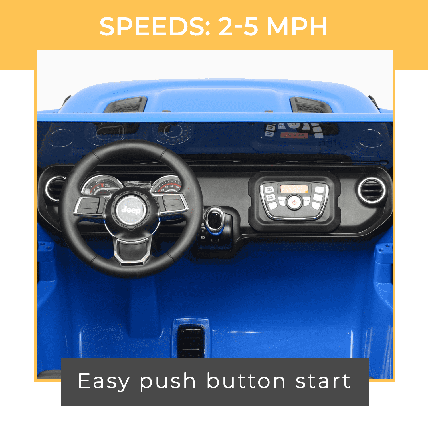 Realistic Jeep Gladiator Rubicon Styling Rev-Roaring Sound Controls Real Doors that Open and Close 2-Seats for Extra Fun This Jeep can move in forward and reverse at 2 – 5 MPH. There are low and high speeds with the reverse Speed at 2 MPH. An easy push button start allows your child to get in and go! The max rider weight is 110 pounds.