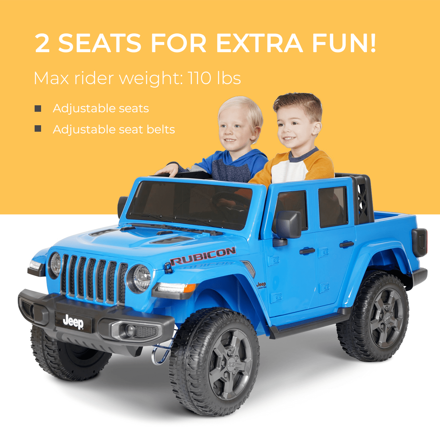 Get your child and come ride in this Jeep Gladiator Rubicon 12V Battery Powered Ride On for girls and boys! With adjustable seats and seat belts, the Jeep fits up to two riders and can reach a maximum speed of 5 mph. Side mirrors also fold in when you need to get in a tight space. Haul your favorite things with an easy to open tailgate and easy to get in and drive away with functional doors! This ride operates with a single pedal and includes Auto-Stop. Ages 3-8 years old, unisex.