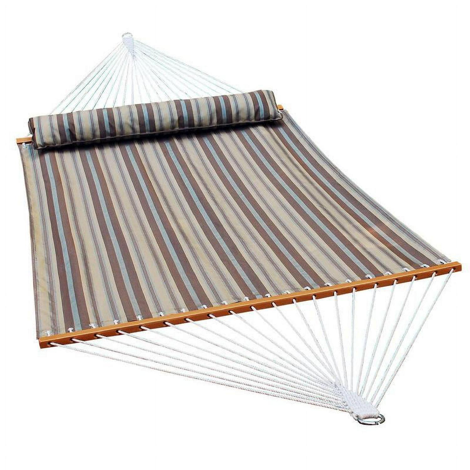 Relax the day away in the Algoma 13 ft. Quick Dry Hammock with Large Pillow. You’ll spend every free moment in your outdoor oasis. It’s big enough for two people, so bring your snuggle buddy! The matching pillow provides even more comfort. It’s made of quick-drying water repellent polyester fabric, so the rain won’t cramp your style for long. Beautiful hardwood spreader bars and poly-rope clewed ends ensure years of enjoyment.