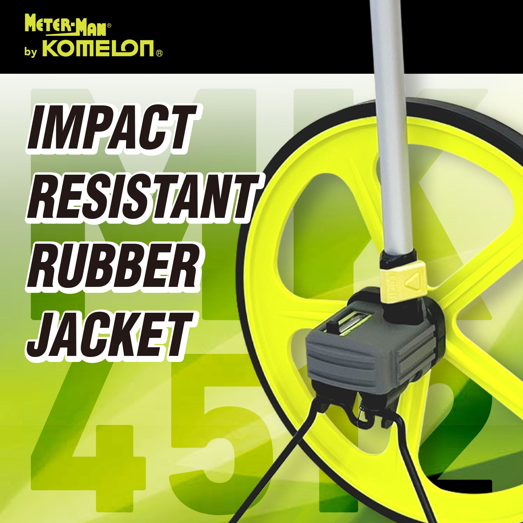 Sold as 1 Each. Measuring range: 0-10000 Feet. Gear driven counter with push button reset and spring loaded kickstand. Magnifying lens for improved readability. Diameter: 14.3-inch. Adjustable twist and lock handle with comfortable pistol grip. Accurate gear driven counter with push button reset. Handle type: Pistol Grip, High Visibility Green. 6 digit counter reads up to 10,000 Feet.. Measuring system: Feet/Inch. Polyvinyl tread for improved traction.