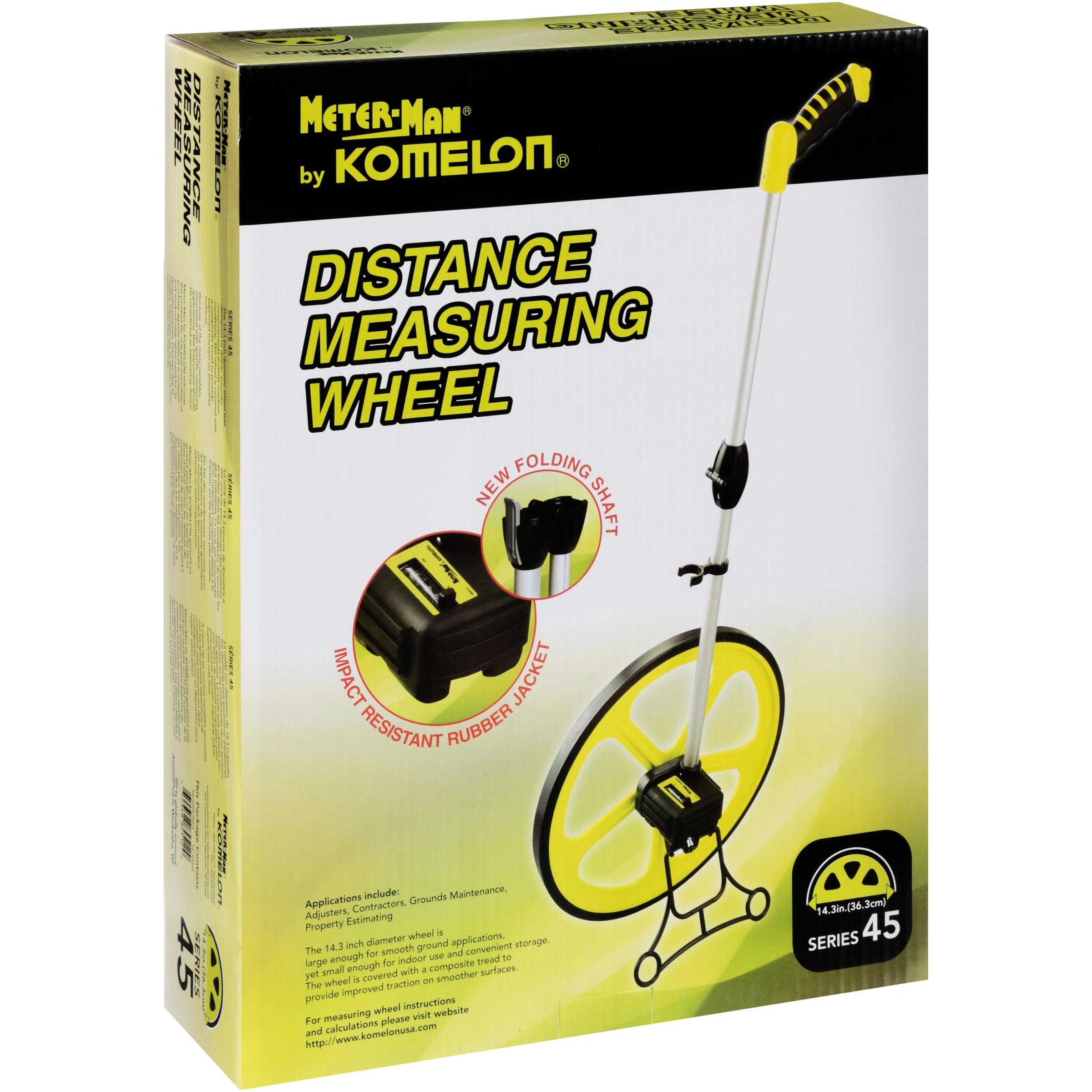 Komelon Measuring Trundle Wheel has an accurate gear driven counter and a kickstand. While it is durable enough for outdoor use, it also has a composite tread to help improve traction on smoother surfaces.Komelon Series 45 Measuring wheel measures 14.3″” Dia and has 6 digit gear driven counter that measures up to 10000′. Measuring wheel with magnifying lens has twist/lock handle and pistol grip for added comfort. Measuring range: 0-10000 Feet. Diameter: 14.3-inch. Handle type: Pistol Grip, High Visibility Green. Measuring system: Feet/Inch. Gear driven counter with push button reset and spring loaded kickstand. Adjustable twist and lock handle with comfortable pistol grip. 6 digit counter reads up to 10,000 Feet. Polyvinyl tread for improved traction. Magnifying lens for improved readability. Accurate gear driven counter with push button reset. Mark off large sections of property for a survey or designate a fence line with ease with this Komelon measuring wheel. This wheel measures up to 10,000 feet, so you can use it for jobs small and large, and its pistol-grip handle makes it easy to use even on rocky terrain. Sold as 1 Each.