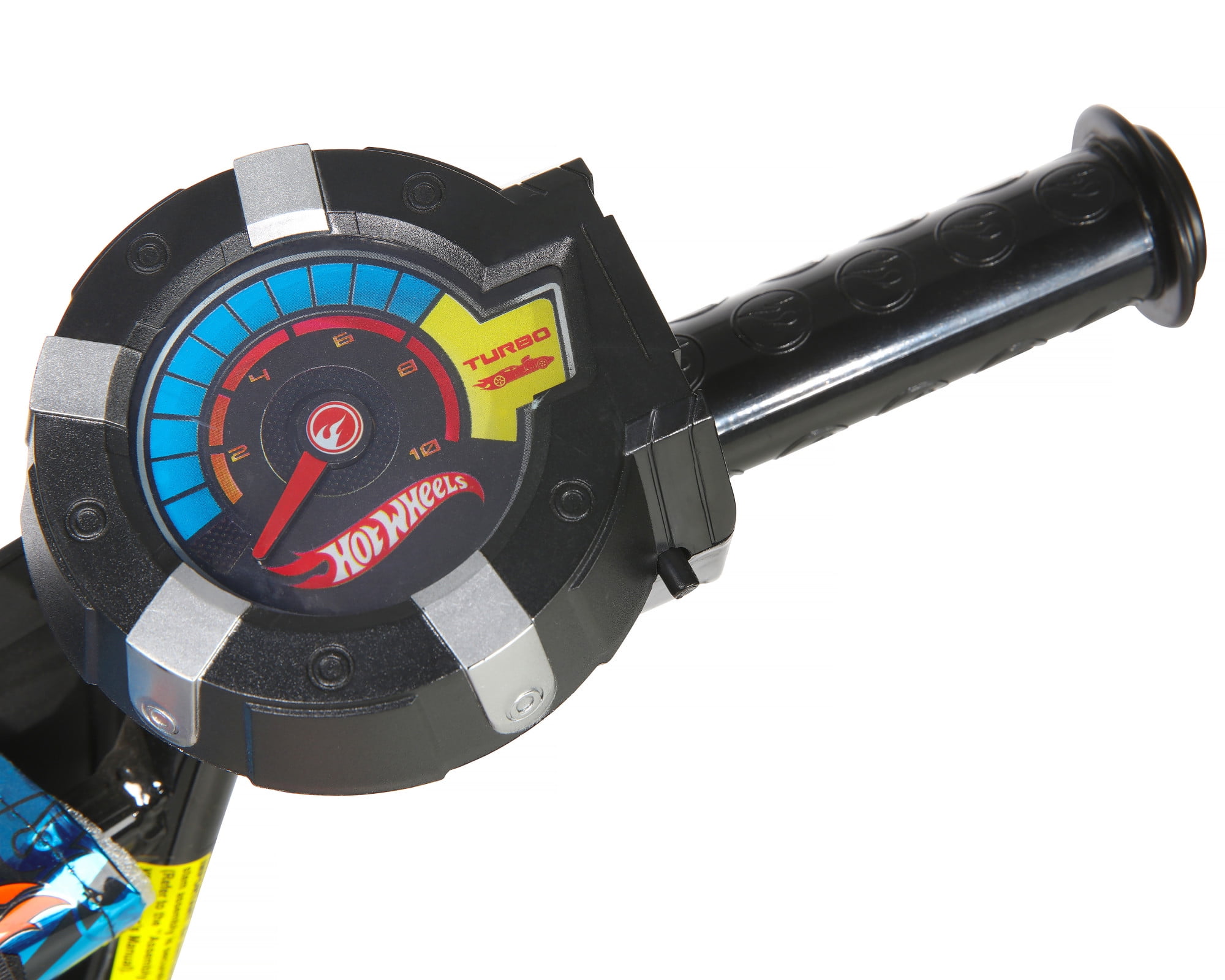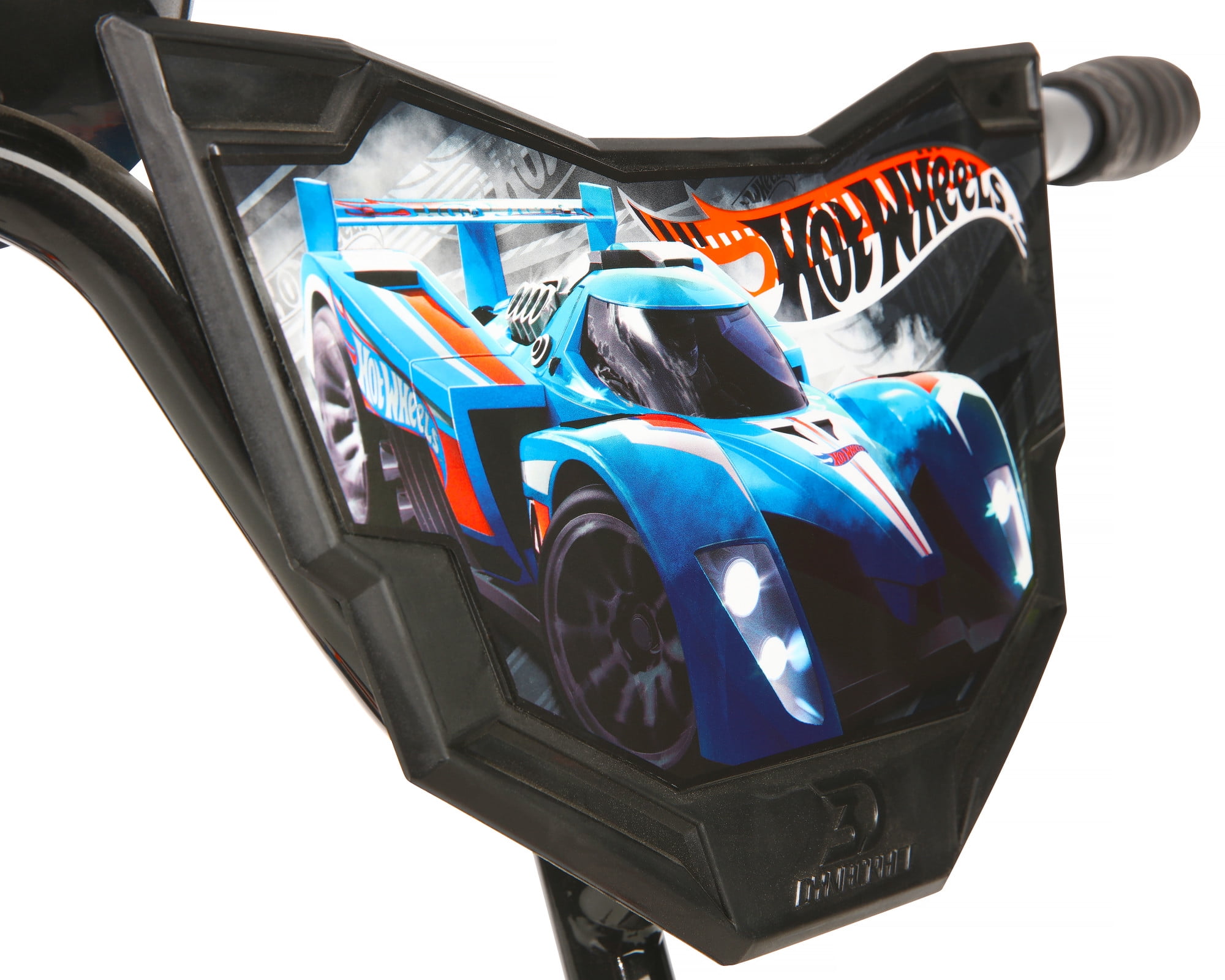 Exciting Hot Wheels-themed design with custom graphics in vibrant blue, orange, silver, and black. Sturdy BMX frame built for durability, ensuring a long-lasting riding experience. All-terrain tires that allow young riders to tackle various road conditions with ease. Rear coaster brakes for safe and reliable stops, providing peace of mind for parents. Unique Hot Wheels Rev Grip that creates a realistic motorbike sound, adding an extra layer of excitement. Suitable for young riders, offering years of fun and adventure. A 16-inch size perfect for kids, balancing between comfort and maneuverability.