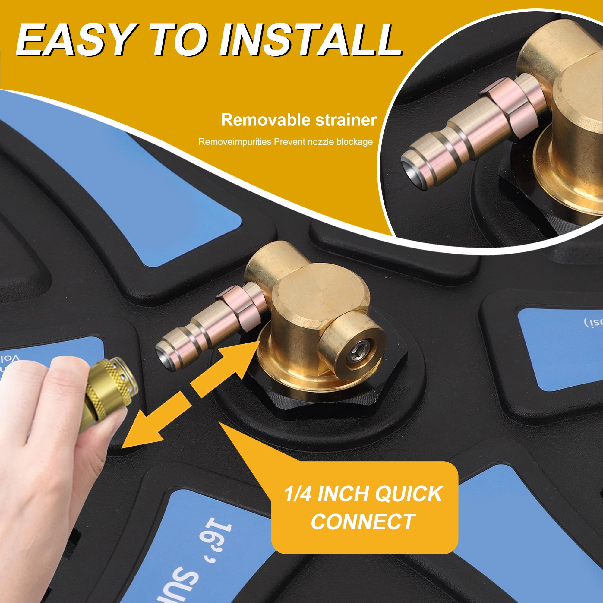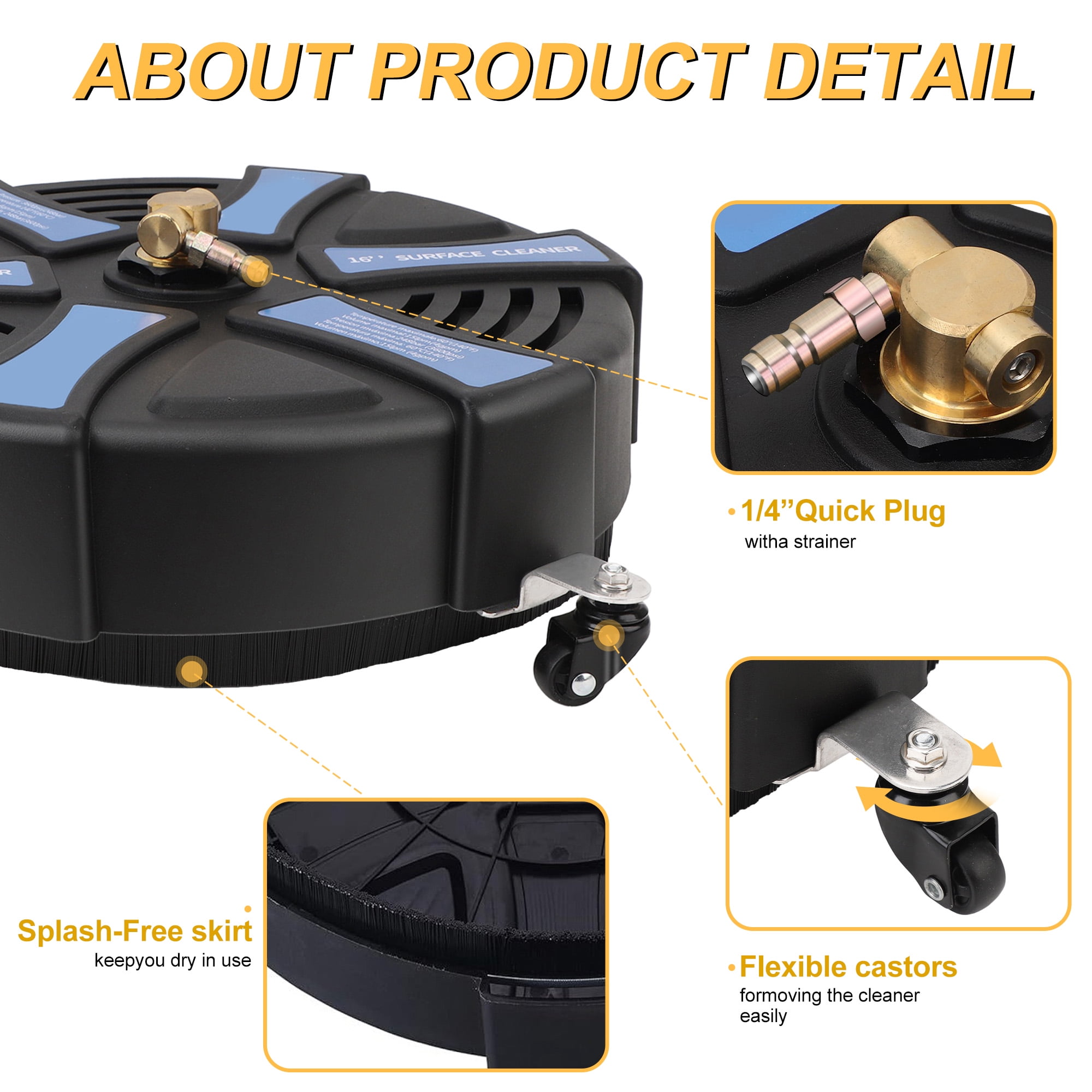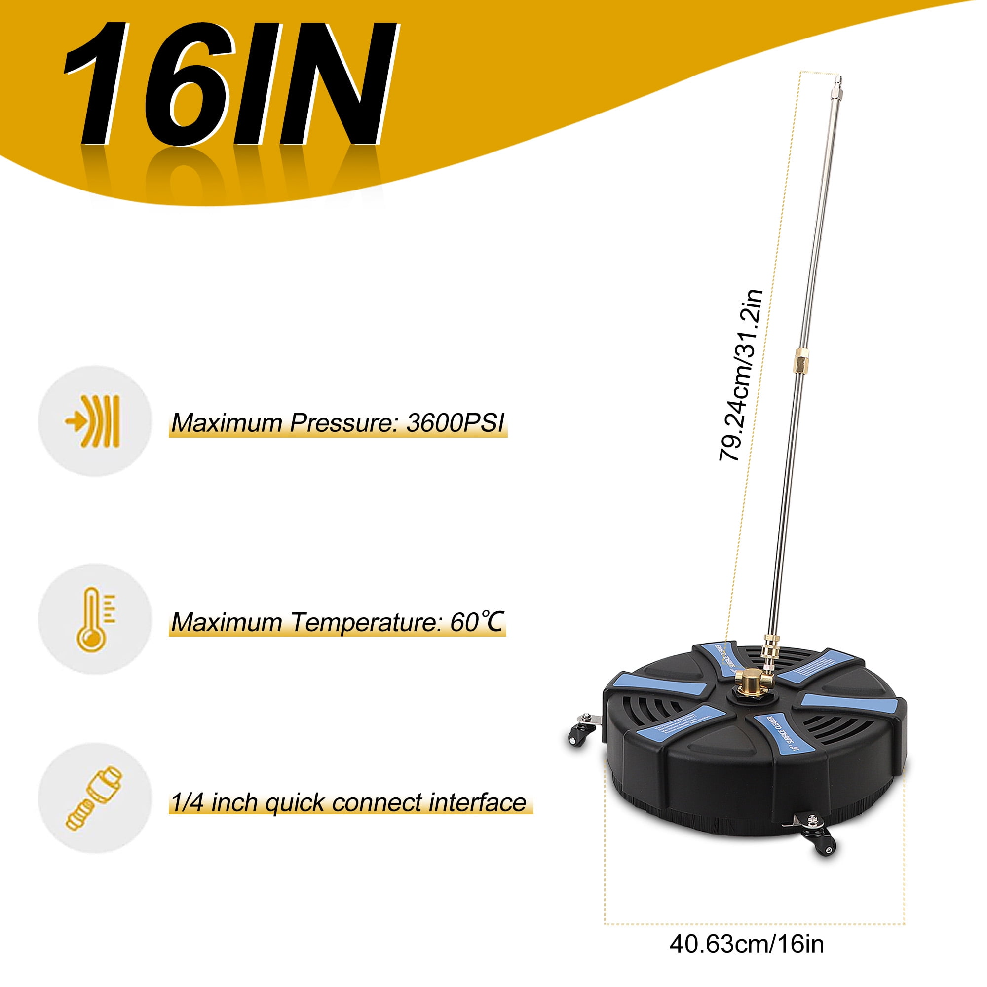 Surface cleaner for pressure washer: The surface cleaner is installed with 3 wheels that help power washer surface cleaner move easily and flexible on large area. Flexible bristle skirt protect adjacent surfaces and resist water splash out while working. Working pressure is up to 3600 PSI. 1/4” standard quick connect fitting. Dimension of the surface cleaner is 16”. Pressure washer extension wands: The length of each wand is 15.6”. 2 wands are connected with thread to avoid leakage at the connection. The end of the wand is 1/4″ quick connect fitting, suitable for most pressure washer attachments with 1/4″ quick connect. Replacement nozzles: To avoid the nozzles blocked, please use water inline filter. And when the nozzles are blocked, you can use needles to remove sand or other debris in nozzles and rinse with fresh water. Latest premium quality: 16 inches pressure washers with three wheels has dual pressure water jets that spin rapidly breaking up dirt and grime without streaking or striping surfaces. It cleans large surfaces up to five faster than a standard nozzle. three pcs 360° rubber wheels for quick movement, easy to control. Widely use: This power washer surface cleaner is very convenient and easy to clean concrete, ideal for cleaning stubborn stains on large flat surfaces such as patios, driveways, decks, sidewalks. And could be used on vertical surfaces like brick walls, stucco and other sidings. High quality: High-speed rotation jets, stainless steel locked nylon brush, heavy-duty bearing, sturdy hard composite construction, ABS-plastic outer shell. Pressure washer attachments give a commercial grade cleaning area of 16 inches wide.