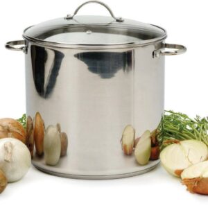 – Large 16-quart capacity with riveted large loop handles. Pot with lid measures 13-inches tall and is 11.5-inches in diameter.
