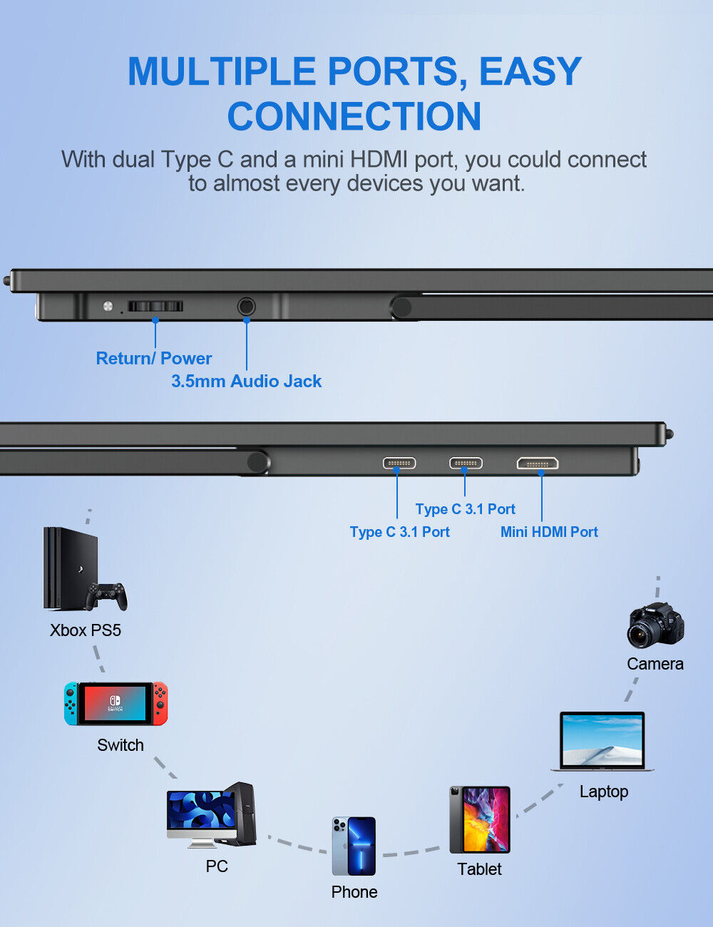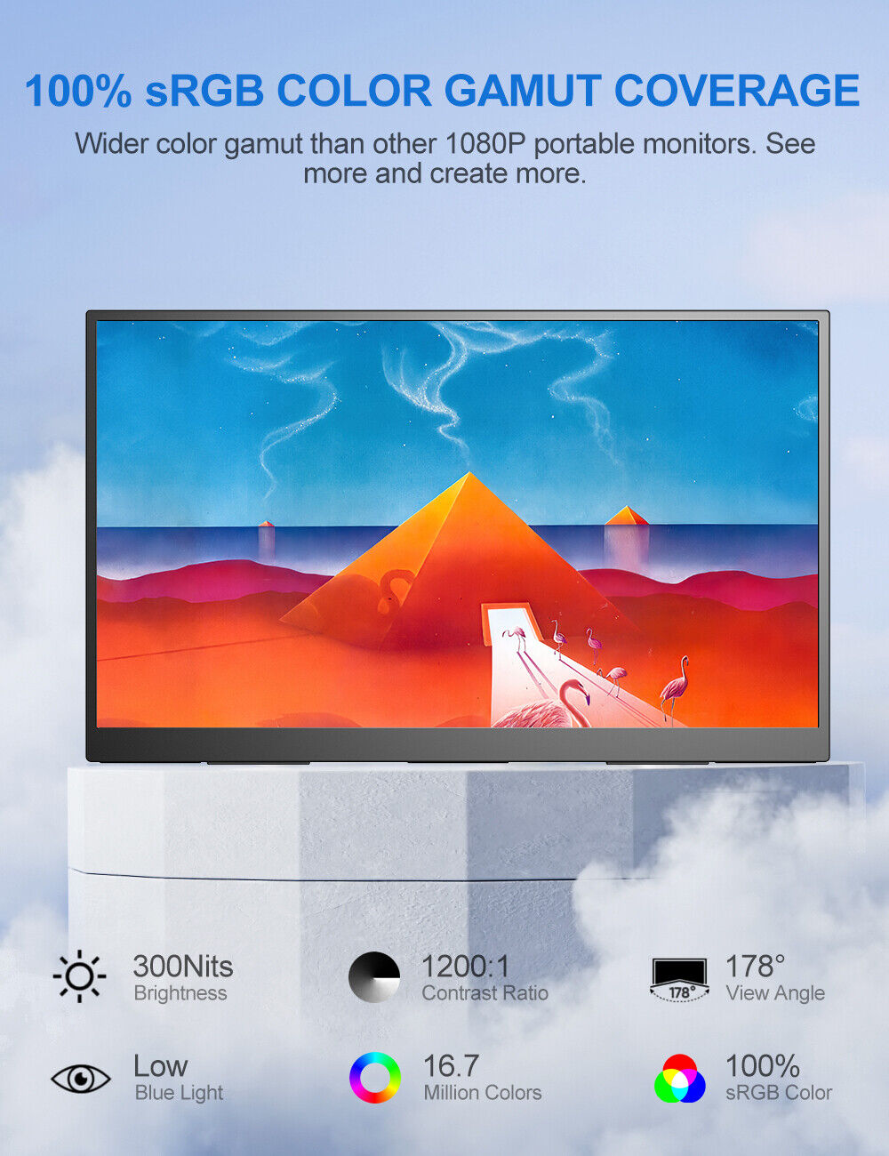 Specifications: 1920*1080 resolution HDR IPS screen 178° viewing angles 2*1W Integrated Speakers Portrait and Landscape Mode Three in one signal port: mini HDMI, Type-C Manufacturer Warranty: 1 Year Warranty Output interface: 3.5mm headphone jack Input interface: Type C full function (Video data & power supply), mini HDMI (transmit digital signal).
