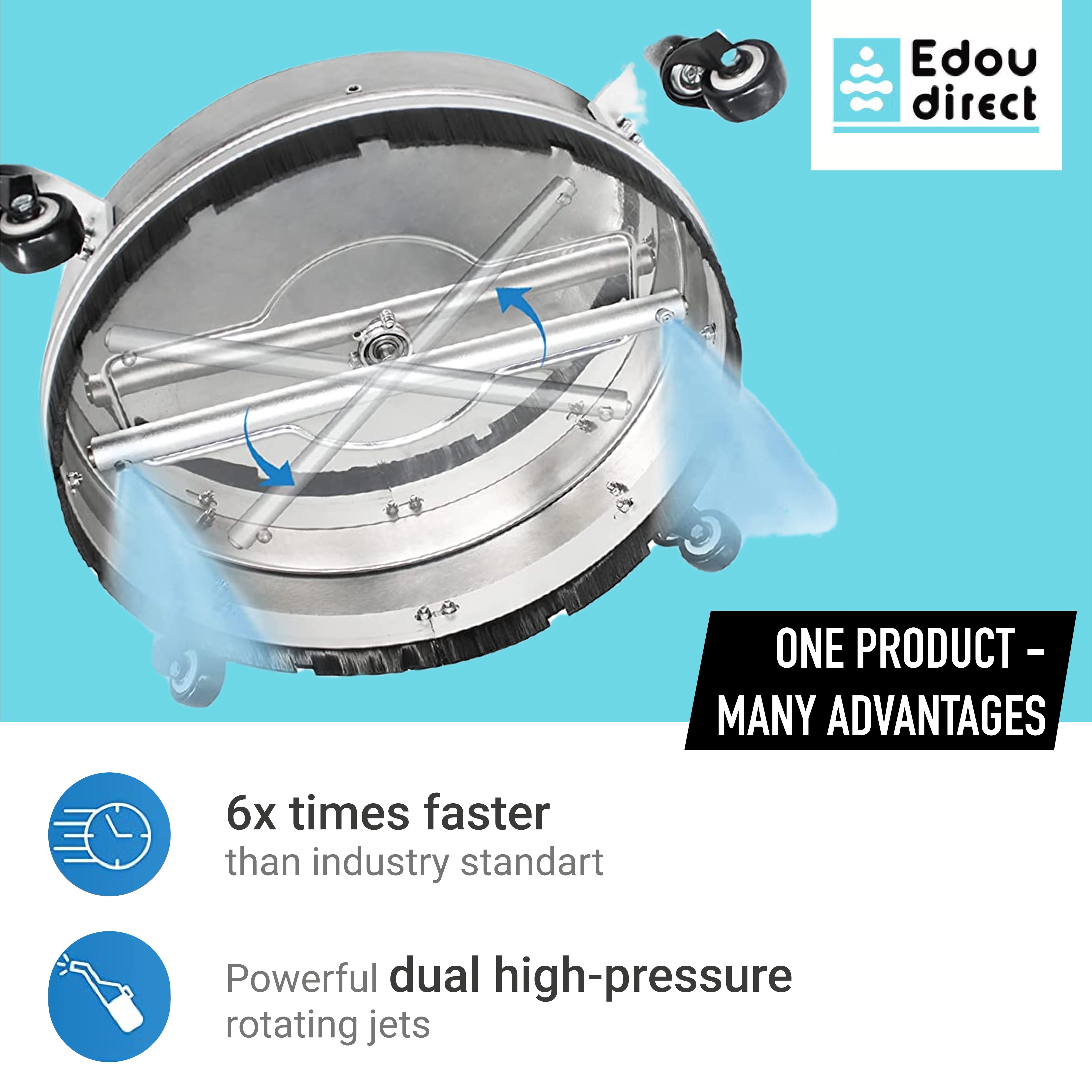 Introducing the 18″ EDOU Direct Pressure Washer Surface Cleaner. Designed for large surfaces, it features an 18″ wide cleaning area, 4 pcs universal castors, and stainless steel bearings. With dual high-pressure jets, it effortlessly cleans surfaces without streaking or stripping delicate areas. The dome housing design controls overspray.